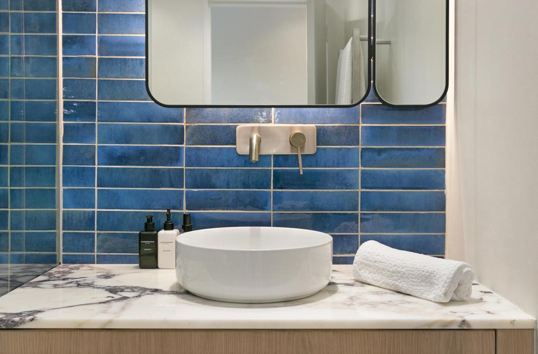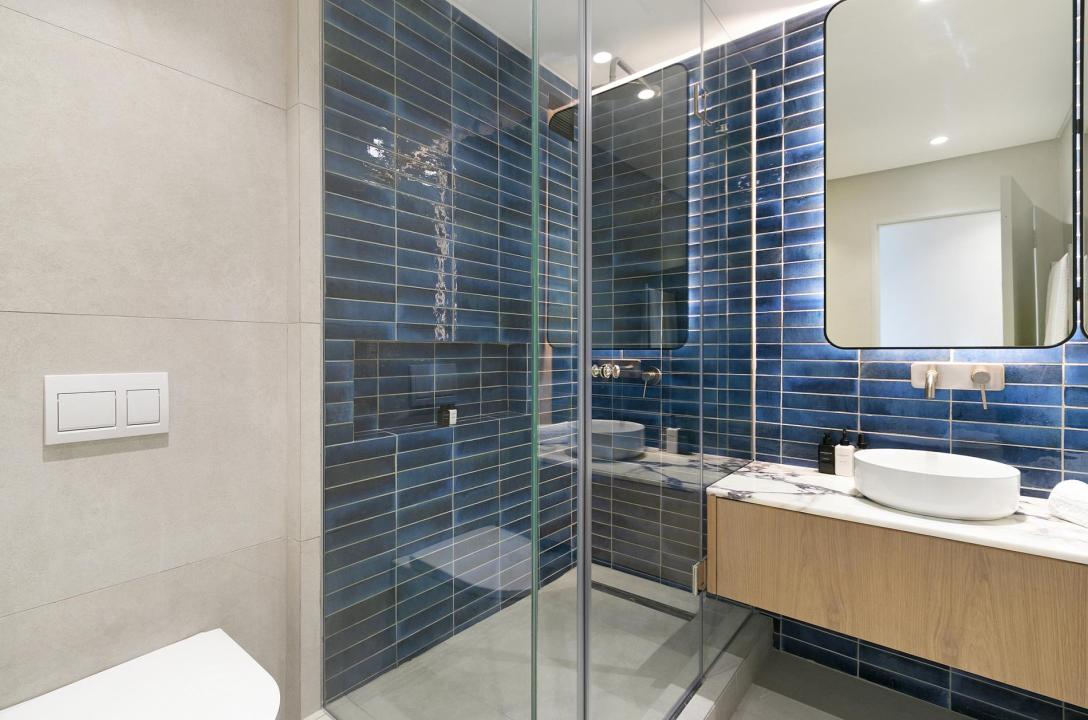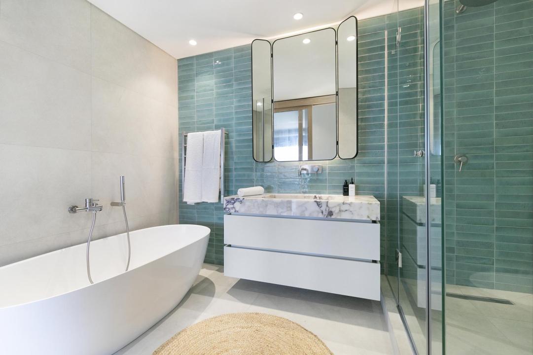 Sleek, contemporary-chic décor continues in the second bedroom which has a queen-size bed, beautiful ocean views, and a separate bathroom with a walk-in shower. Both bedrooms have to be air-conditioned.