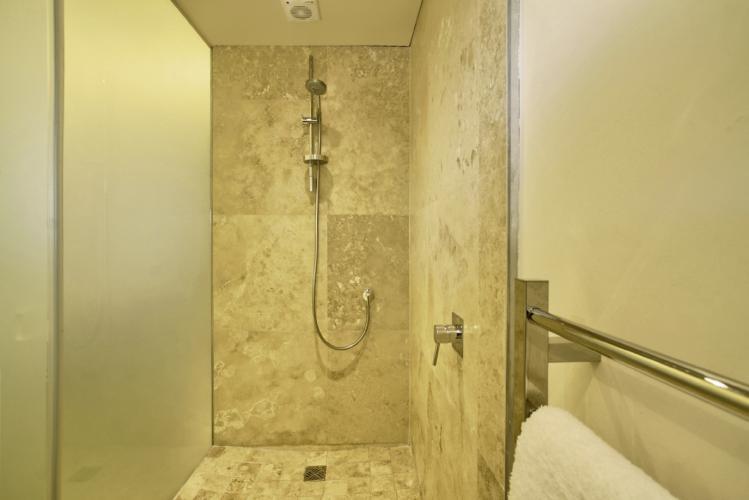 There is a small bathroom with hand wash basin, toilet and hand bidet, heated towel rail and spacious shower. No bath. Pure cotton towels and linen.