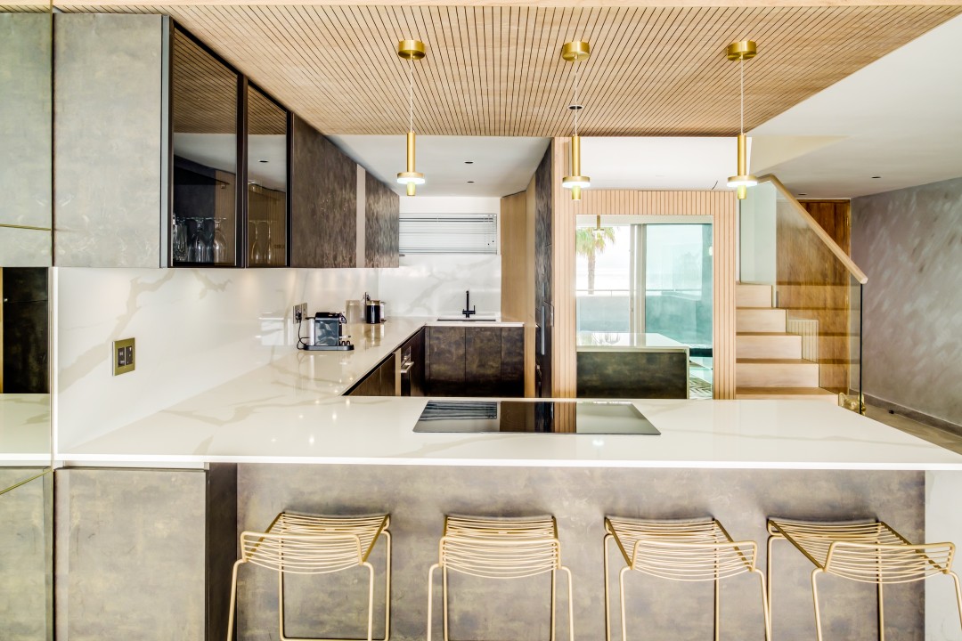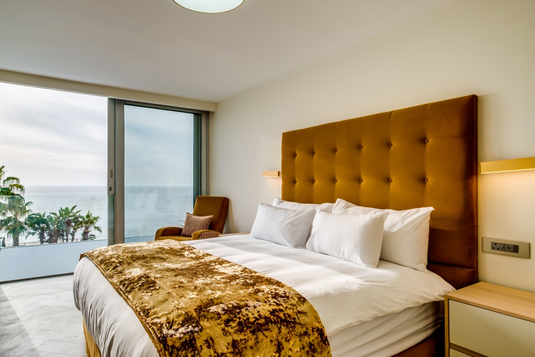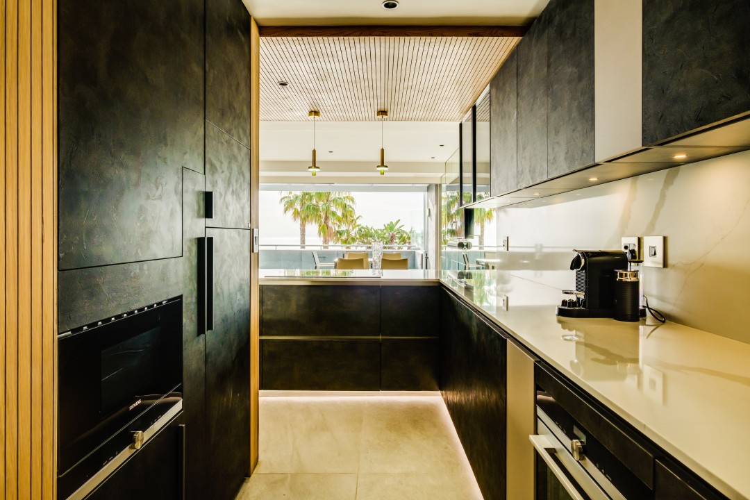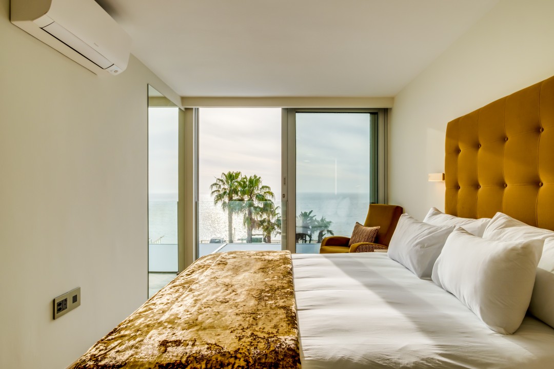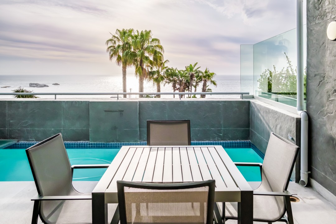 The main living area is light and spacious. The furnishings are sleek and minimalist but offer everything you need. This room opens onto a private balcony with a swimming pool.