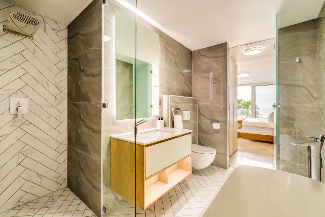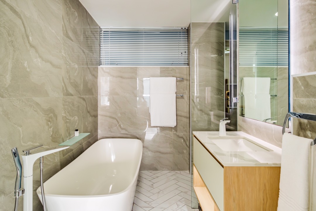 Ensuite with bath, shower and single vanity
