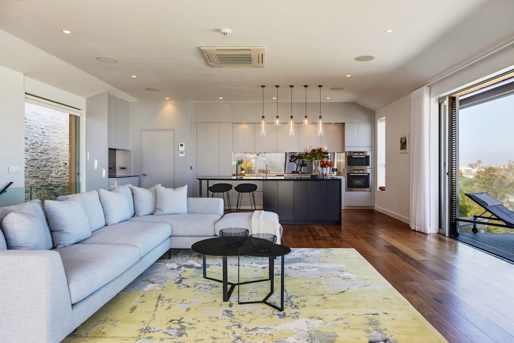 Inside there is a spacious and light open plan kitchen and living area. Large sliding doors to both the front balcony and main deck allow the sea breeze to flow in and also maximises the abundant sea views. The kitchen is extremely well equipped, while the lounge area is cosy and comfortable – a place to either enjoy the views or settle into a film on the flatscreen TV.