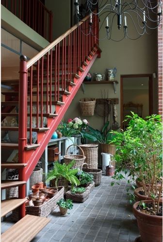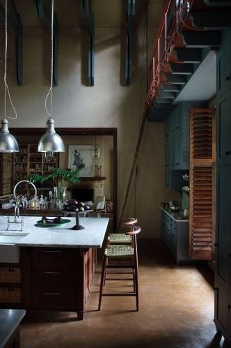 There are whimsical areas: Between the living area and the kitchen, a miniature conservatory is stocked with a collection of glass vases, all waiting for their load of flowers and greenery. The kitchen is in itself a cathedral: high arching white walls and struts carry your eye upwards and then down to marble working surfaces. A grand red Parma ham machine, the culinary version of a vintage Bentley, is the kitchen’s sculpture.