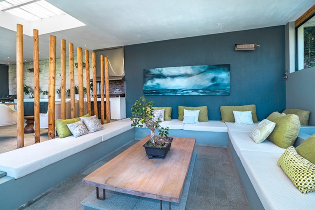The modern fully fitted kitchen has a center island with breakfast seating for 6, scullery with dishwasher, modern appliances and a Nespresso machine. The kitchen leads out through glass sliding doors onto a spacious patio area with both gas and wood burning barbecues and seating for 12. The patio boasts a sunken lounge area with built in couches to relax and enjoy the warm summer days.