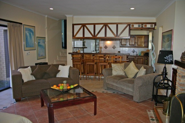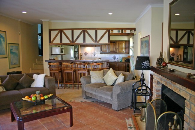 Stand-alone holiday rental cottage with large living area with gas fireplace and TV bar.