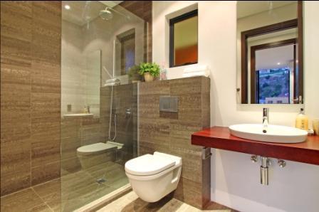 A wooden staircase leads from the entertainment area to the second level where you will find the well appointed en-suite Master bedroom. A king sized brown leather bed with satin and silk sheets, designer wooden furniture and breath taking views await you. The generous en suite bathroom offers a large bath, walk in shower and basin with lots of cupboard space in the same cool tones found throughout the apartment. A wooden staircase takes you to the next level where the ideal work from home office is found. A comfortable leather sleeper couch chair and glass top office desk make up the space with its very own private balcony from which to enjoy a much deserved break while enjoying the panoramic mountain and city views.