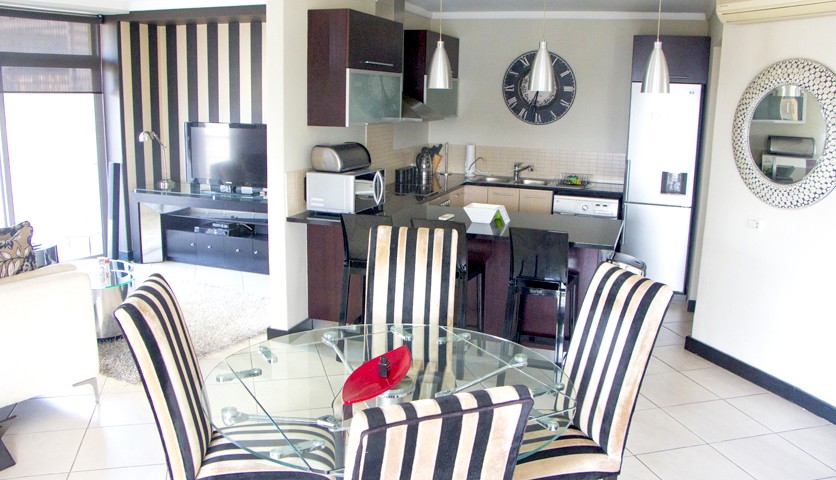 In town for business? Perhaps attending a convention at the Cape Town International Convention Centre (CTICC). Apartment Dino is a superior, elegantly furnished 1-bedroom, 1 bathroom apartment on the Foreshore, offering all the luxuries one would expect from a top-class hotel. The contemporary furnishings, open-plan living areas with tiled floors flow onto a spacious, private corner balcony, where one can enjoy the sunsets over Table Bay Harbour and the V&A Waterfont. Located in the same development is a Laundromat, a coffee-shop and a Food Lover’s Market offering fresh produce, ready-to-go-meals, snacks, etc.