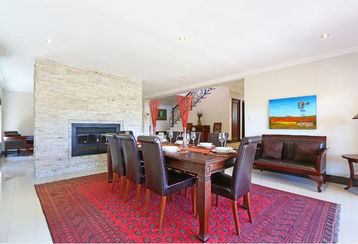 This elegant home-away-from-home features a vast open-plan interior in the main house that includes the kitchen, dining area, lounge and a pool table area, all situated around a large pillar with a fireplace.
