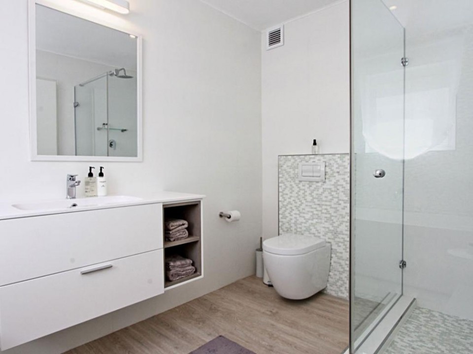 There is DSTV and Netflix available as well as an aircon. A sleek kitchen features all the appliances needed for comfortable holiday living, including a double fridge/freezer, built-in oven and hob, dishwasher, washing machine and neat breakfast bar with two stools. Floor-to-ceiling sliding windows open from the lounge onto the terrace and offer spectacular ocean views. The apartment has two lovely air conditioned bedrooms and two bathrooms, one of which is en-suite. The spacious master bedroom boasts a king-sized bed, walk-through closet, a cosy workspace with a desk, an informal sitting area with a couch and a large en-suite bathroom with a soaking tub and shower. The second bedroom offers a twin-to-king bed, and a dedicated bathroom with shower.