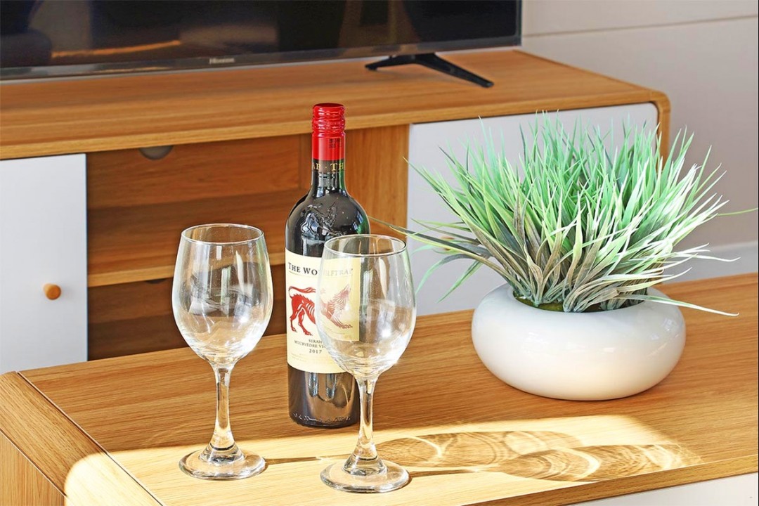 267 Eden on the Bay is equipped with everything needed for an amazing self-catering stay. The beautiful main interior is open plan with the kitchen leading to the lounge. The kitchen is fully equipped, including a kettle, fridge, microwave, and a built-in oven with a stovetop. Both bedrooms are furnished with queen beds, they are modern and beautifully decorated.