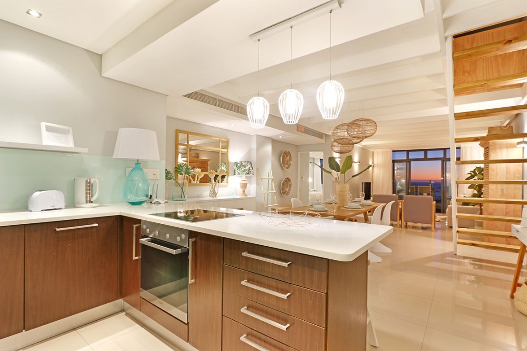 The kitchen is fully equipped, including a kettle, fridge, microwave and a built-in oven with a stove top. The luxuriously furnished lounge offers ocean views and a flat-screen TV with DStv decoder, with additional loft lounge area with two sleeper couches and stunning bay views.