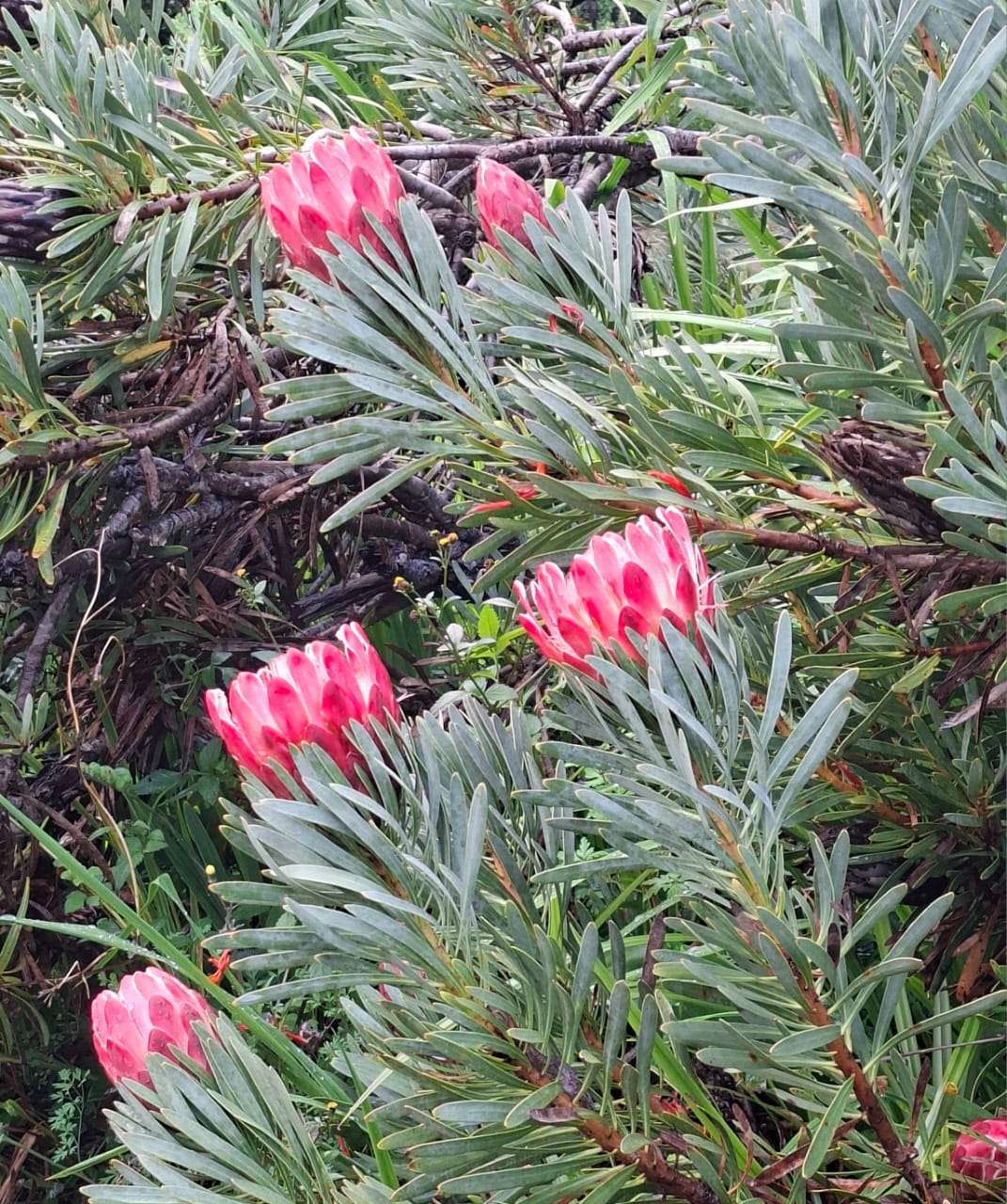 Blushing pink proteas burst through silvery green foliage along the mountain path—a striking reminder of the Cape’s floral splendour even in the quiet of winter.