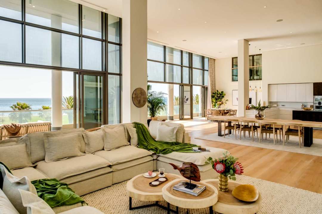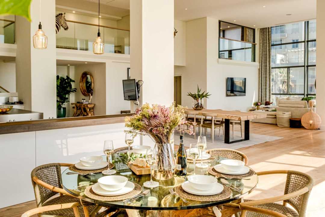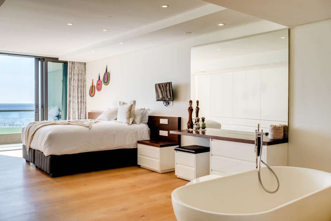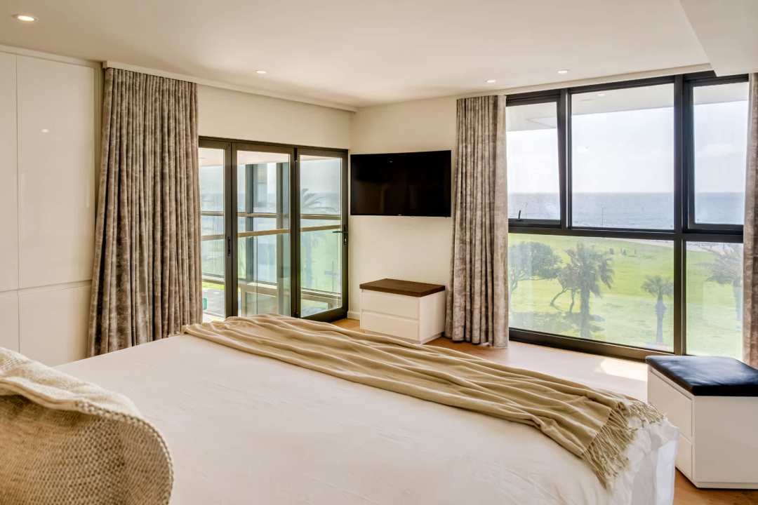 George on the Bay is an elegant African-inspired apartment located in the vibrant seaside suburb of Mouille Point. This modern retreat offers breathtaking sea views from nearly every room, including the spacious living area with seating for eight, a dining area, and balcony access. The sleek kitchen is equipped with modern appliances and also provides stunning sea views. These beautiful rooms have double-volume ceilings, flooding the rooms with light and the ocean breeze. The apartment features four stylish bedrooms, all with air conditioning, desks, and en-suite bathrooms. The master and third bedrooms boast king beds and open-plan bathrooms with double vanities. The second and fourth bedrooms have double beds and private en-suites. Outside, a cosy balcony provides seating for four, offering the perfect spot to relax and take in the ocean breeze. Additional conveniences include a separate laundry room, building security, an alarm system, and a generator that powers the entire building, ensuring a seamless stay. George on the Bay is a private sanctuary, perfect for a seaside escape.