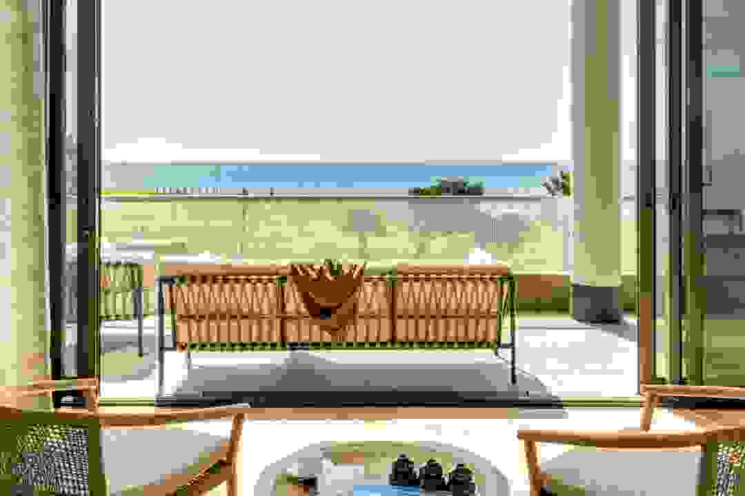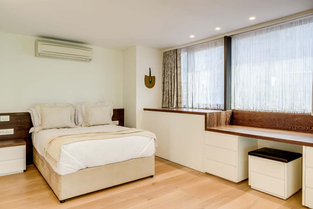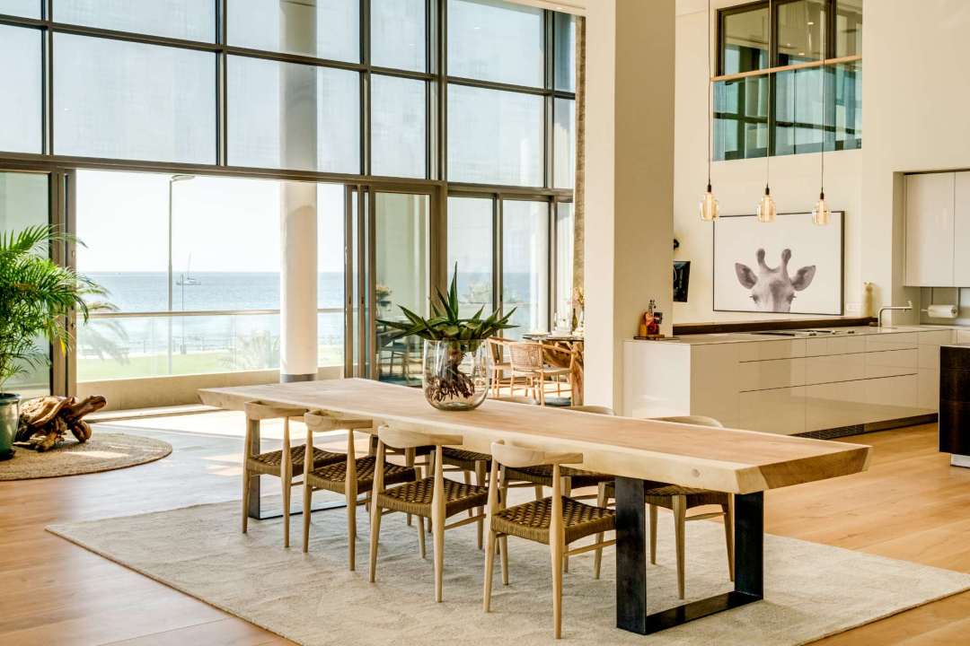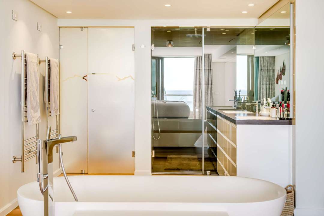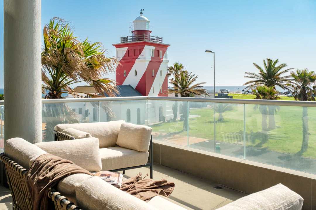George on the Bay is an elegant African-inspired apartment located in the vibrant seaside suburb of Mouille Point. This modern retreat offers breathtaking sea views from nearly every room, including the spacious living area with seating for eight, a dining area, and balcony access. The sleek kitchen is equipped with modern appliances and also provides stunning sea views. These beautiful rooms have double-volume ceilings, flooding the rooms with light and the ocean breeze. The apartment features four stylish bedrooms, all with air conditioning, desks, and en-suite bathrooms. The master and third bedrooms boast king beds and open-plan bathrooms with double vanities. The second and fourth bedrooms have double beds and private en-suites. Outside, a cosy balcony provides seating for four, offering the perfect spot to relax and take in the ocean breeze. Additional conveniences include a separate laundry room, building security, an alarm system, and a generator that powers the entire building, ensuring a seamless stay. George on the Bay is a private sanctuary, perfect for a seaside escape.