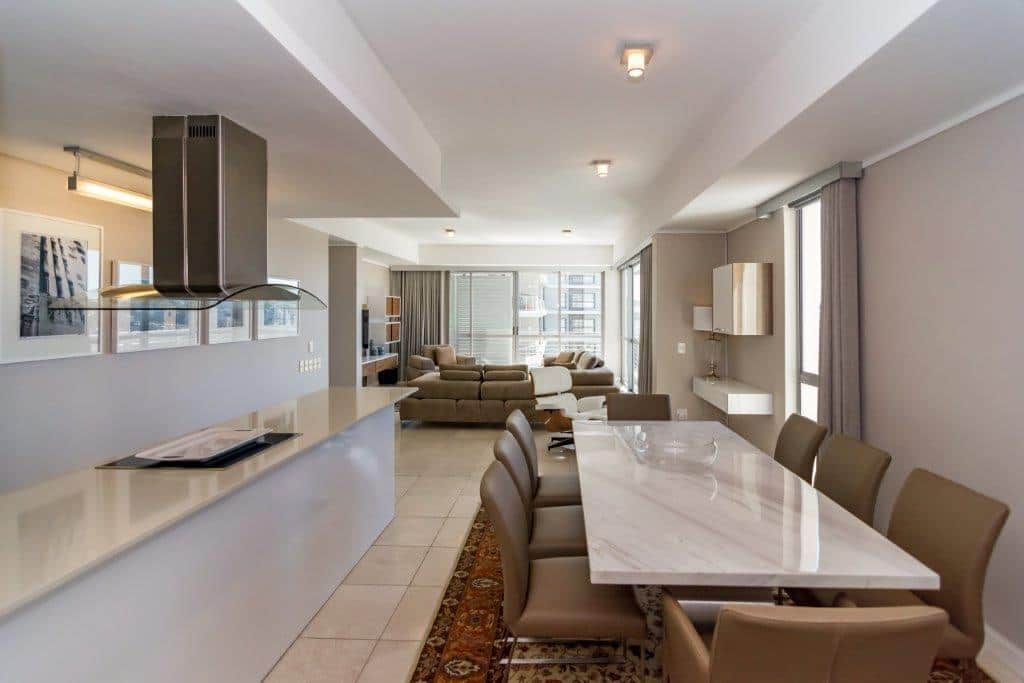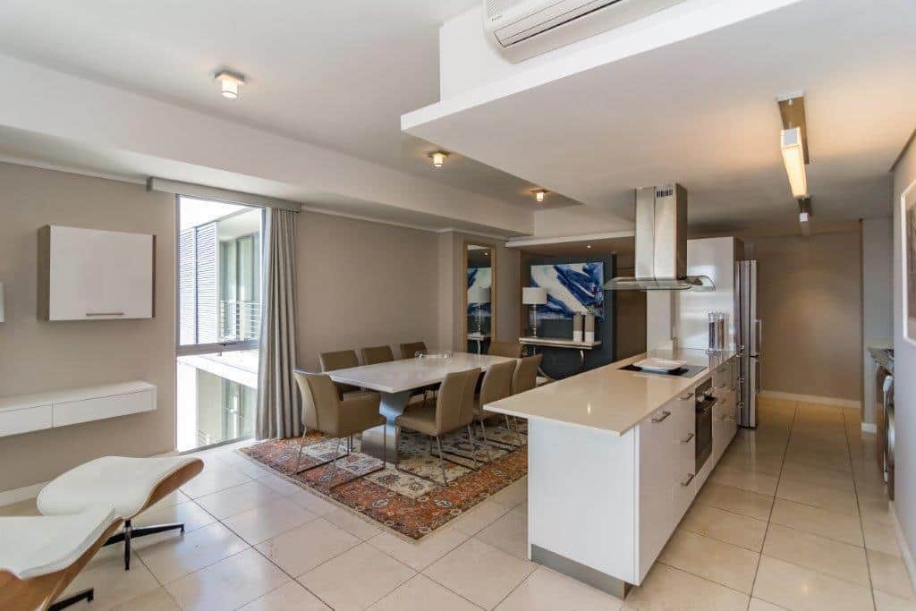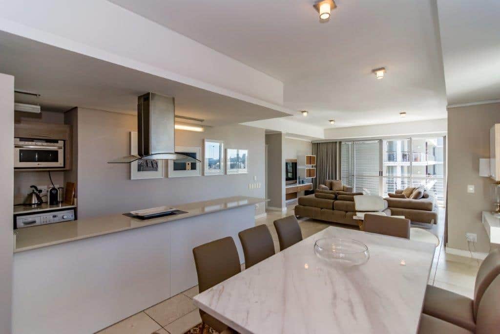The open plan, kitchen, lounge and dining areas of the apartment, lend themselves to light entertaining.The master bedroom offers stunning mountain views of Table Mountain, as well as the workings of the inner city.