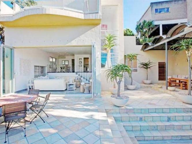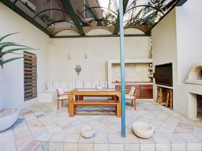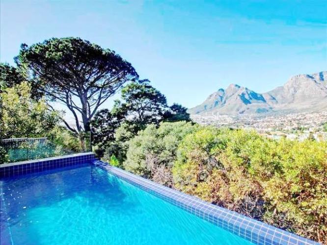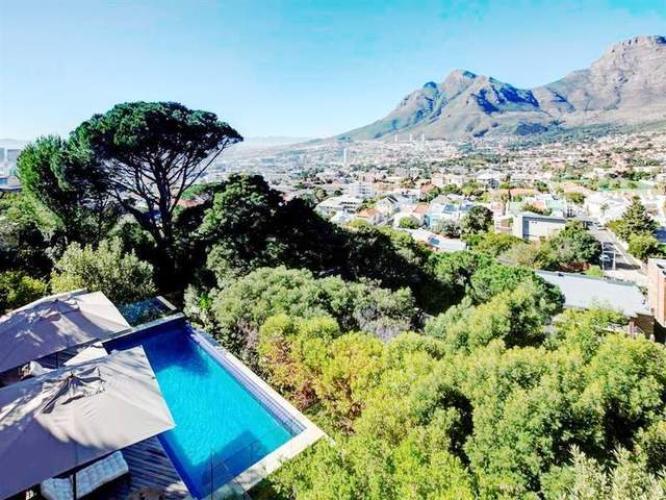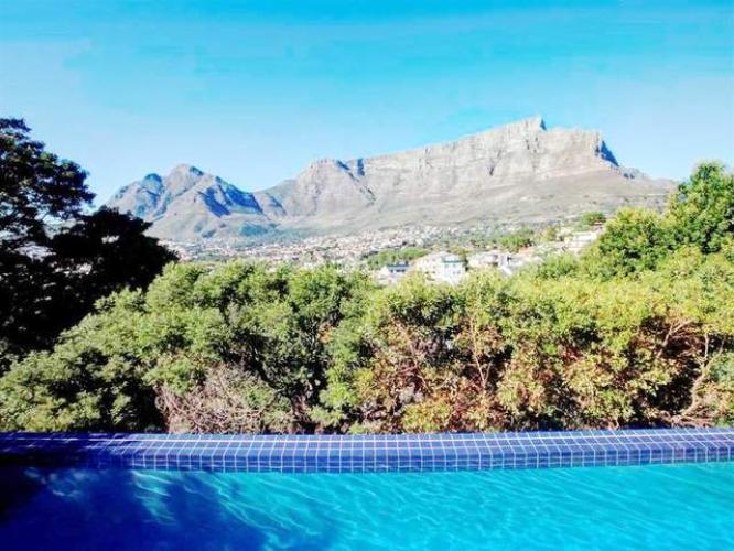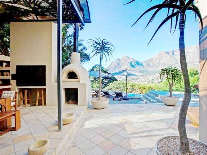 A luxury Tamboerskloof home. The 4 bedroom home sleeps 8 + 2 people. The home is beautiful with amazing views. This spacious patio with Pizza opens up on the pool deck and past it is the ever-present Table Mountain.