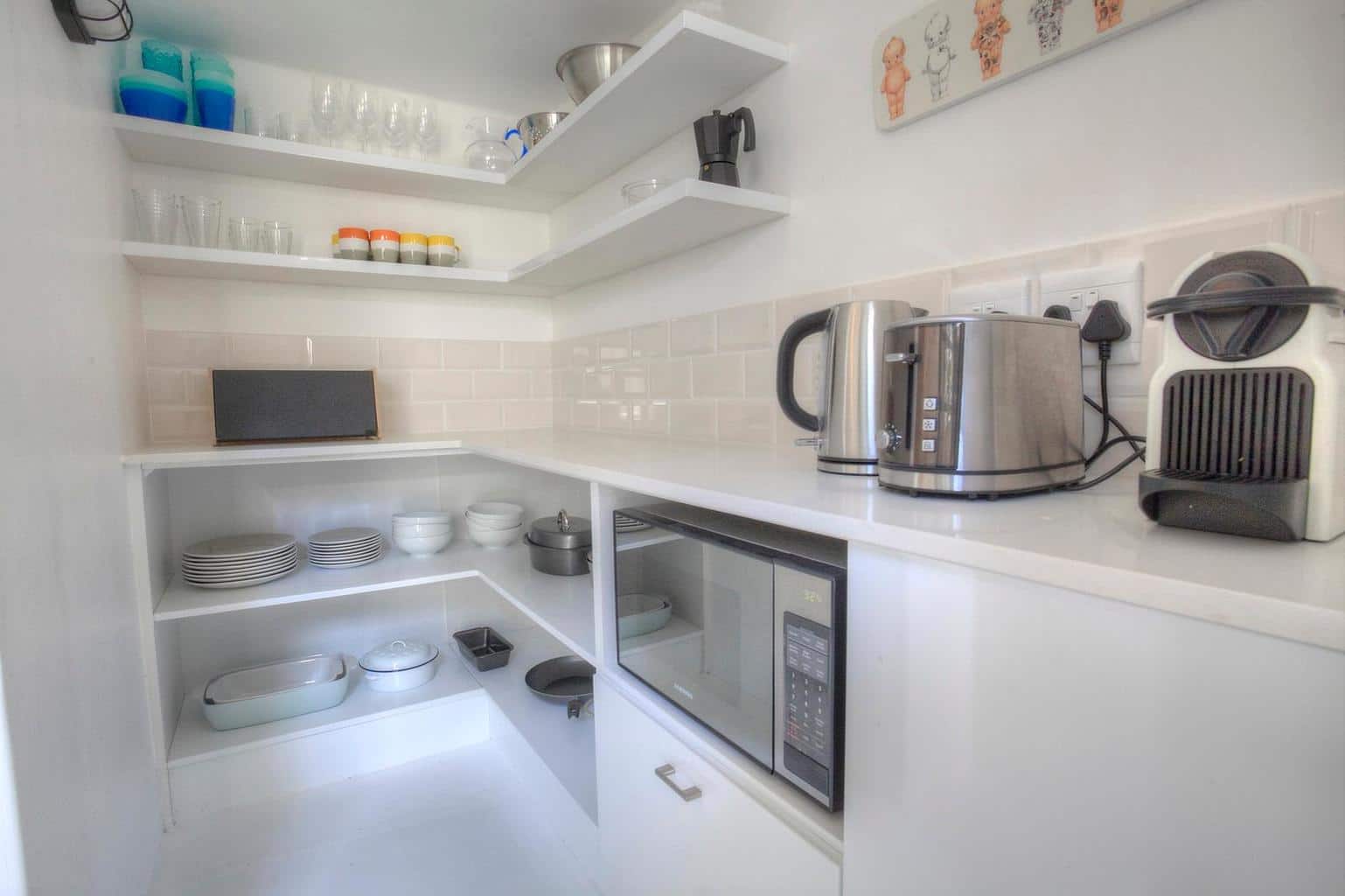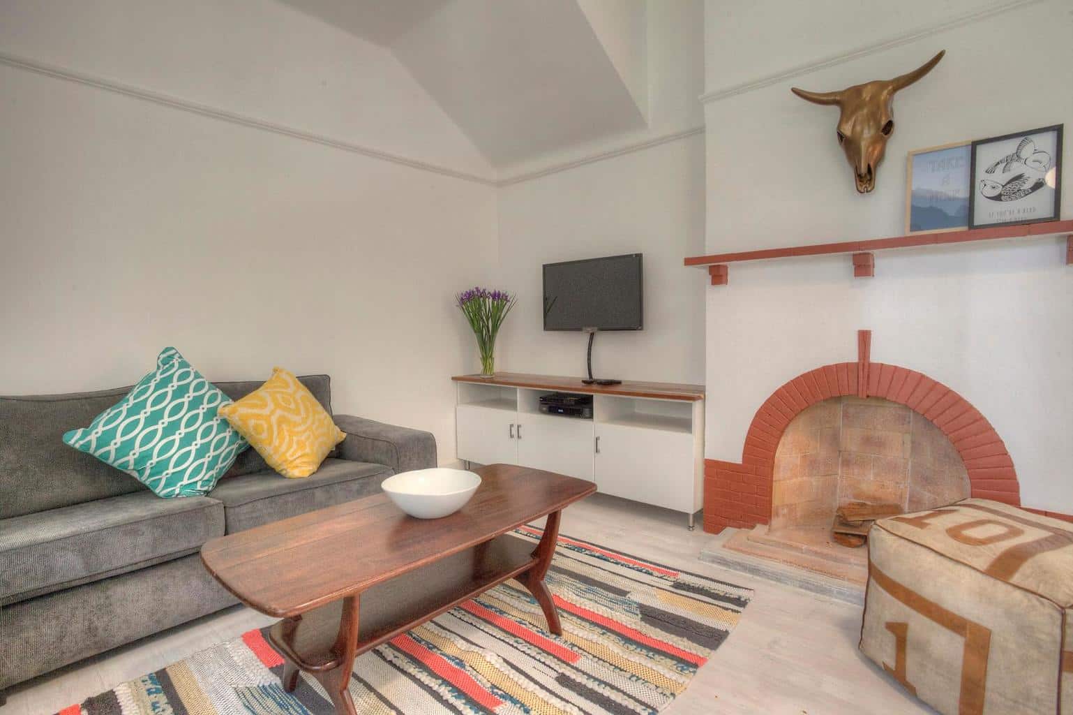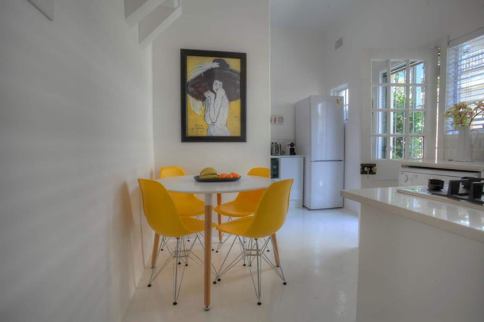 When entering the apartment, one is met with a lovely porch surrounded by beautiful plants and lots of fresh greenery and bench with comfy cushions. The living area is stylishly decorated with a single L-shaped couch, TV with DVD player and a cute fireplace. This leads to a lovely, bright kitchen done in shade of white with yellow accents from the sitting area giving it a vibrant look. It has a small gas stove, dishwasher plus all other essentials. The kitchen leads to a courtyard with a picnic bench and private laundry room plus beautiful flowers and sunshine during summer that brings it to life. There is a weber braai (bbq) in the courtyard.