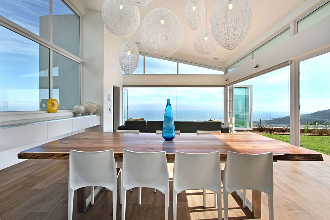 The living pavilion has a double volume ceiling and all folding doors open up onto the outside living area. An Assirelli kitchen, 10 seater dining table and a couch seating area complete the living area that offers uninterrupted views of Lions Head and the 12 Apostles, Camps Bay beach and out over the sea.
