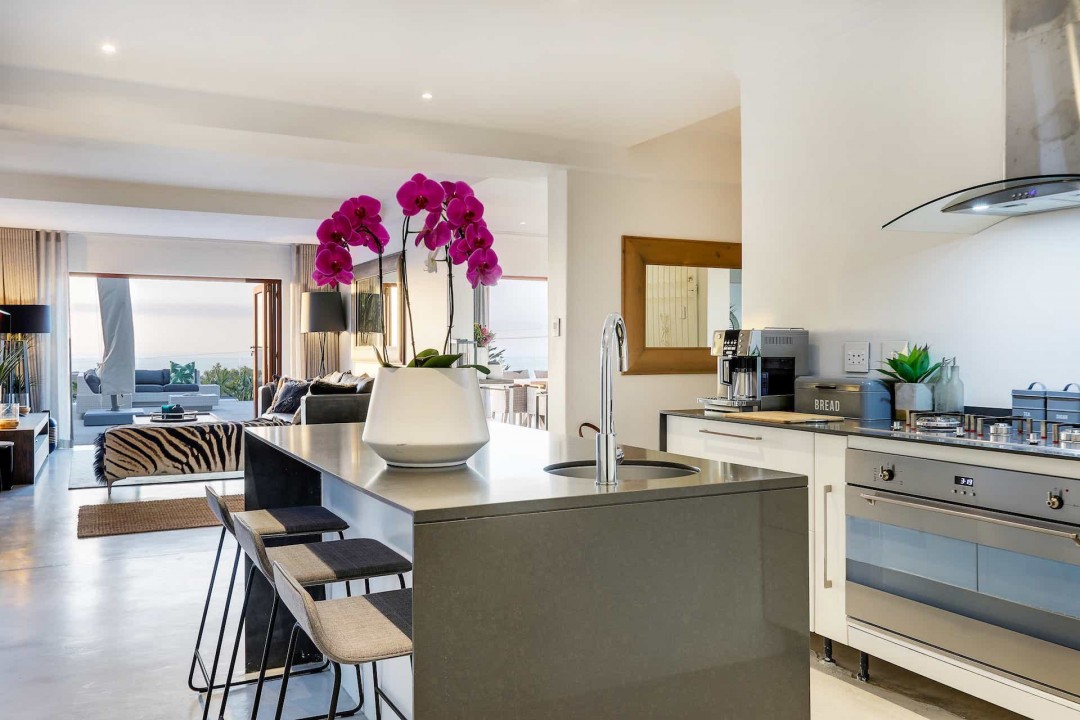 Indoors, plush seating, a flat-screen TV, and air-conditioning ensure comfort year-round. The fully equipped kitchen—featuring sleek white and charcoal tones, premium appliances, and a breakfast bar—connects to a chic dining area with seating for eight and uninterrupted ocean views.