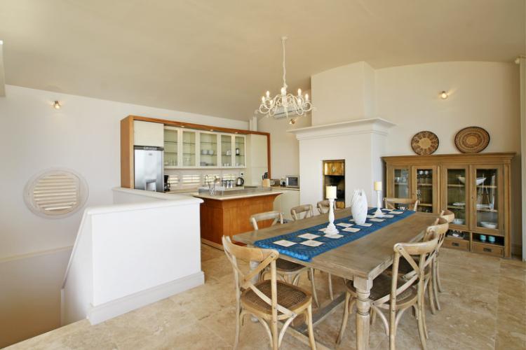 Upstairs is the entertainment area. It has a large open plan modern fully equipped kitchen with a dining room table that seats 8 people. Has a huge Flat screen satellite TV with comfortable couches, which open up onto the outside deck. The outside deck has a round day bed, 2 loungers, an outside table that seats 10 people under a latte roof and an 8 seated Jacuzzi. It also has a swimming pool on the lower level of the house. It is a fantastic house for entertaining and for sundowners in the evenings overlooking the ocean.