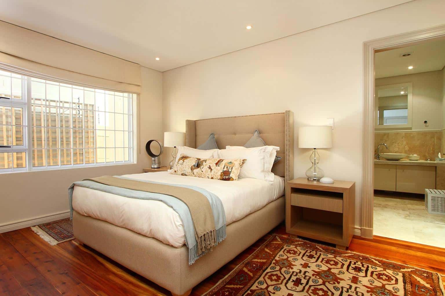 The property features three full size bedrooms and one half-sized bedroom with a single bed and dedicated bathroom. The master bedroom is spacious and welcoming, with a queen-size bed and beautifully refurbished wooden floors. A walk-in closet links the bedroom to the tiled en-suite bathroom, which houses a large shower, corner bathtub, bidet and twin vanities, and the room opens out onto the front patio of the house.