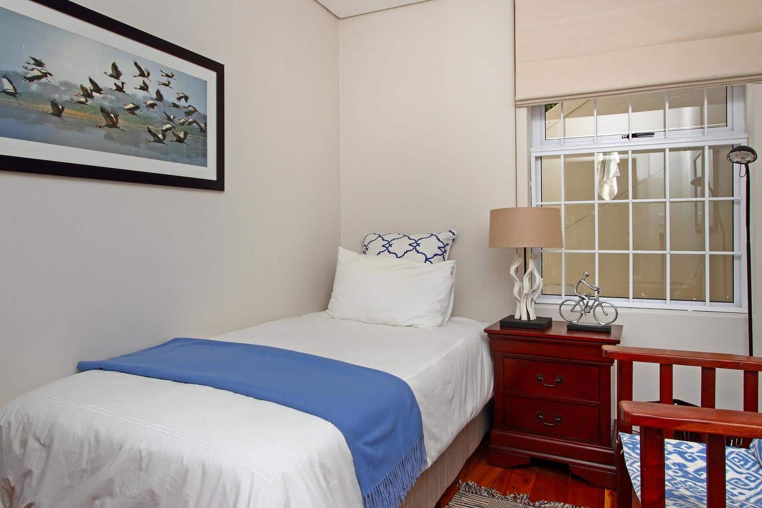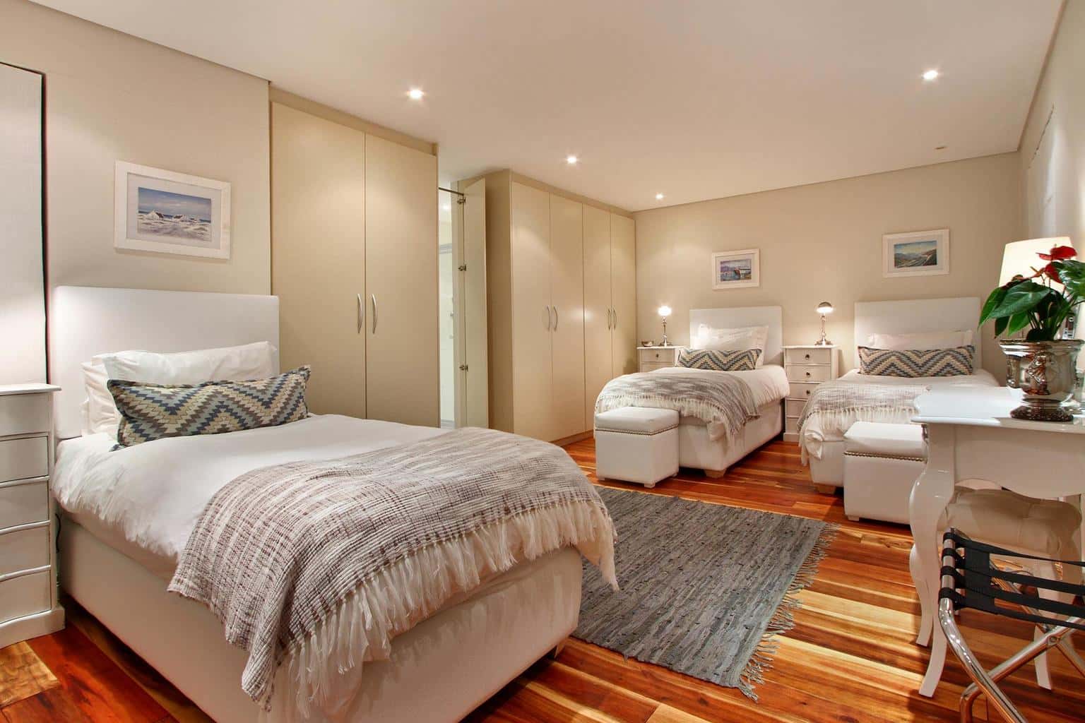 The second bedroom has a queen-size bed with en-suite bathroom and shower, while the third room offers three single beds and a large en-suite bathroom with walk-in shower. The fourth bedroom is a small enclave with a single bed, chest of drawers and fan – ideal for an au pair or babysitter staying over – and has the use of a dedicated bathroom with a shower that can also serve as a guest toilet on the ground level. All bedrooms have ample cupboard space and can access a cosy, covered patio and private courtyard at the back of the property.