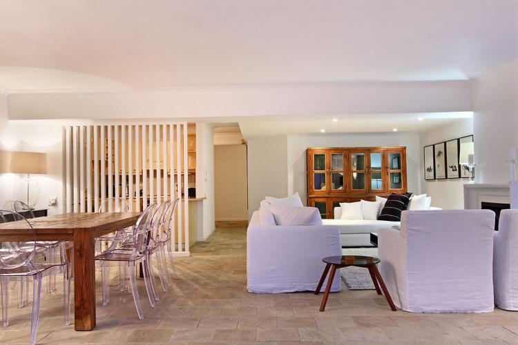 The neutral, flagstone tiles of the open plan living and dining room complement the alternating shades of white, naturally illuminating the house with ample sunlight. Contemporary furniture blends with the period fireplace, creating strong visual contrasts; the turquoise of the swimming pool complements the large wooden pieces of this spectacular vacation rental. Details of the interior and the exterior have been done with perfection, giving La Vue a delightfully luxurious finish.