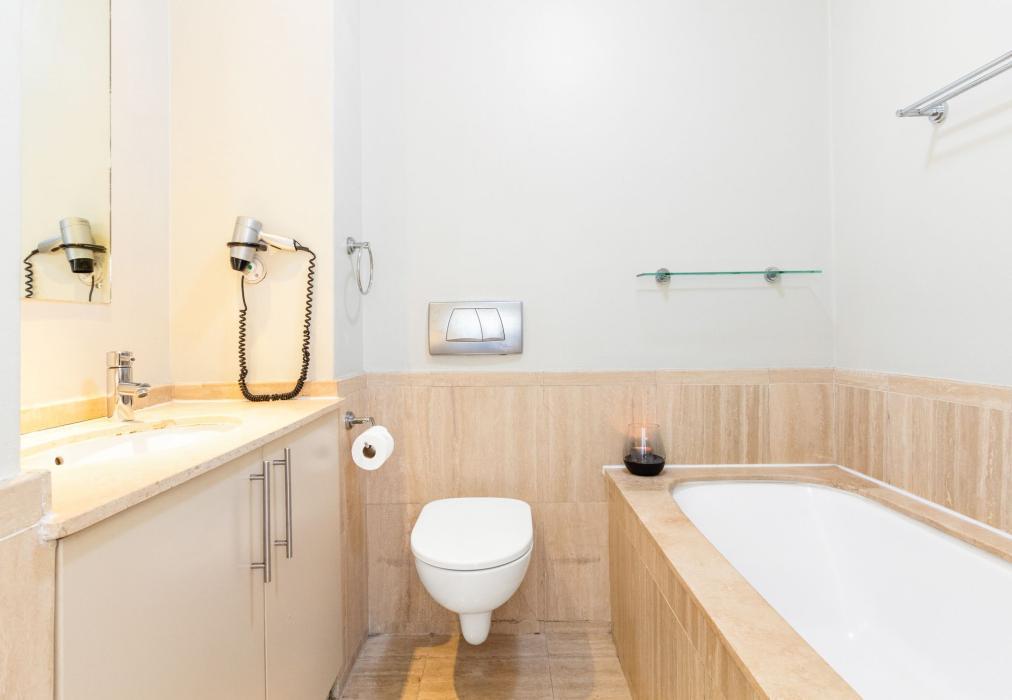 Both bedrooms are elegantly furnished with luxury double beds, maintaining the apartment’s modern style. The main bedroom boasts an en-suite bathroom with a shower/bath combo, basin, and toilet, offering privacy and convenience.