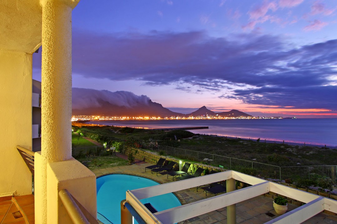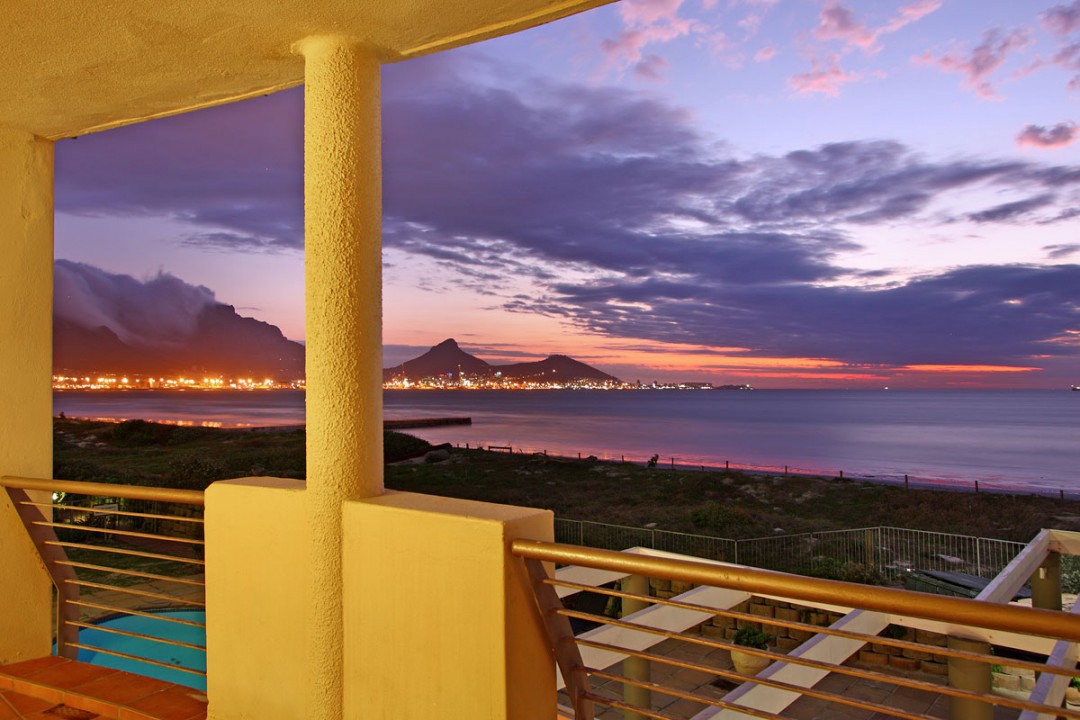 The beautifully furnished bedroom with an overhead fan comprising of a double bed has plenty cupboard space and dressing table with en- suite bathroom containing a bathtub and shower. The spacious kitchen, dining area and lounge are open plan, with the lounge leading out to a balcony with stunning views of the beach below, the Atlantic Ocean and Table Mountain in the distance with the glittering lights of Cape Town beneath it.