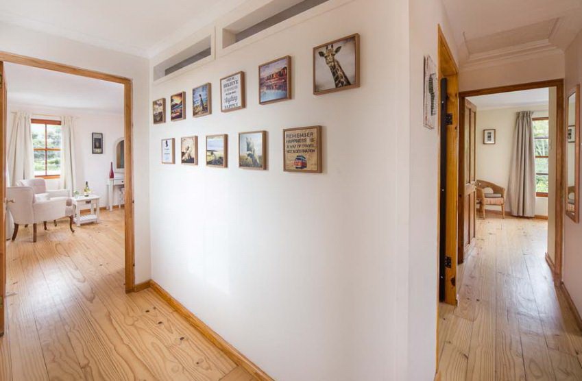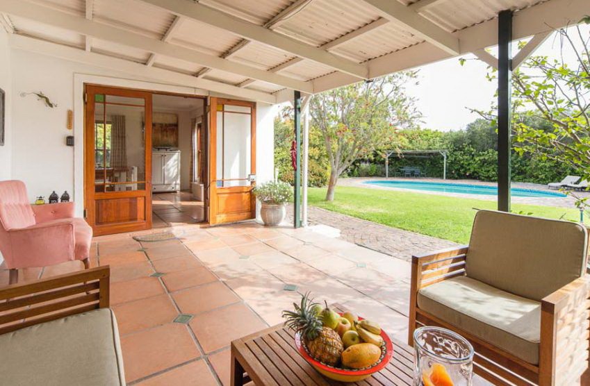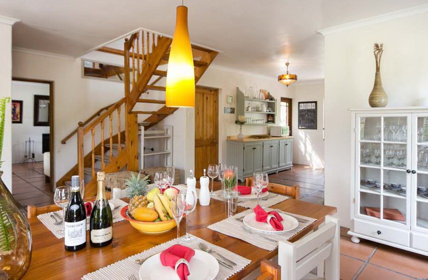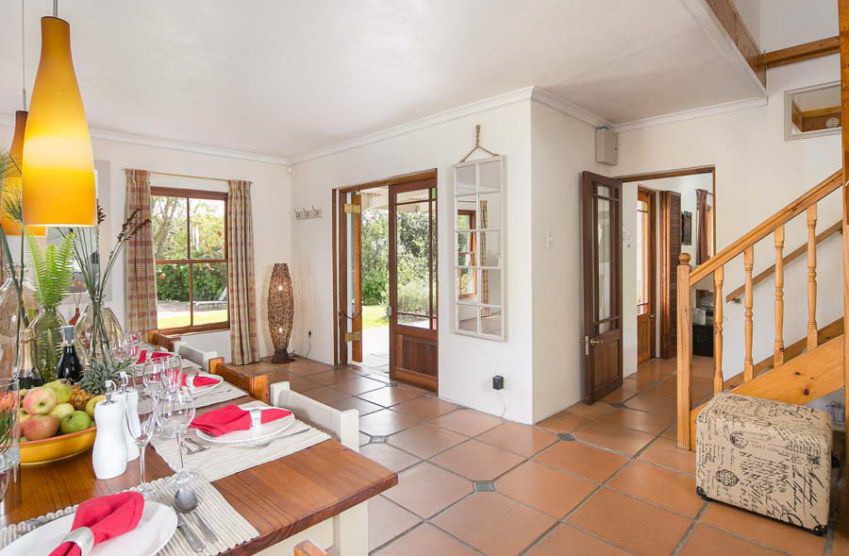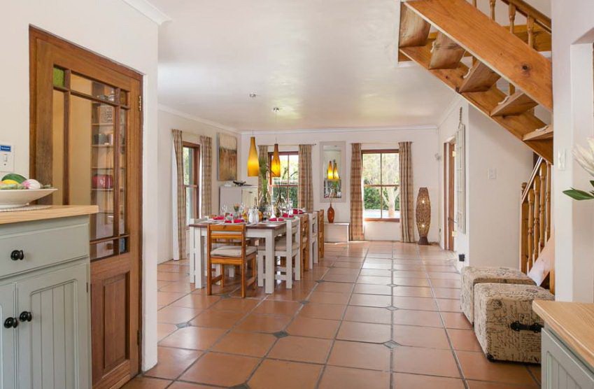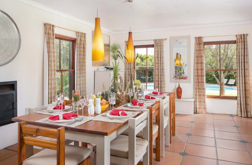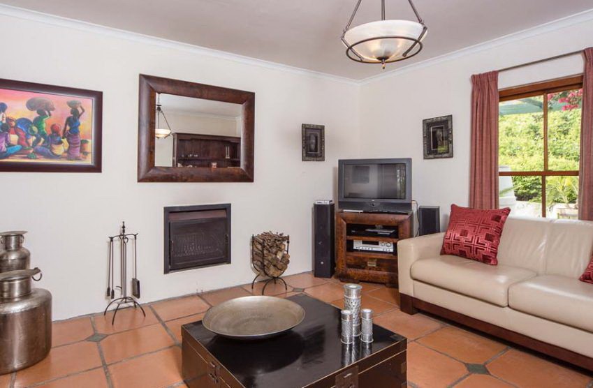 The large dining room is characterized by the warm tint of the furniture and the 10 seater-dining table. On the few colder days in Noordhoek during winter an open chimney provides a pleasant atmosphere.