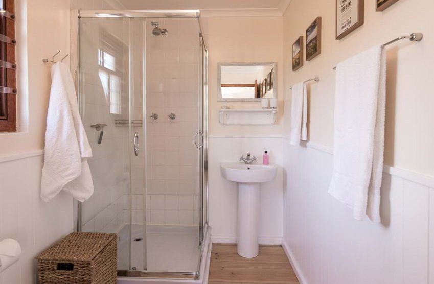 The bedroom Cape Point offers a queen size sleeper couch. During the day this room serves as an additional open plan lounge with a coffee table and some books. At night this room can be closed and is an ideal bedroom for children. The main bathroom is fully equipped with a shower and a bathtub. There is a third toilet in the basement close to the dining room.