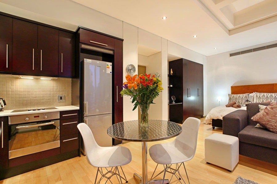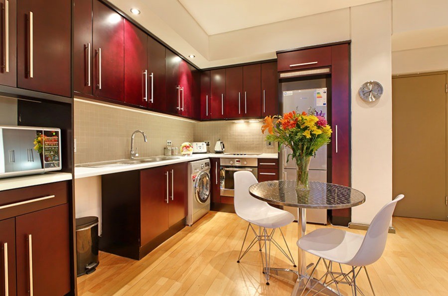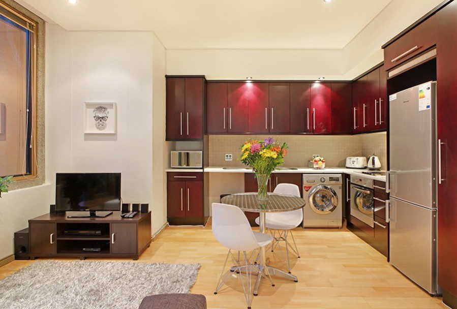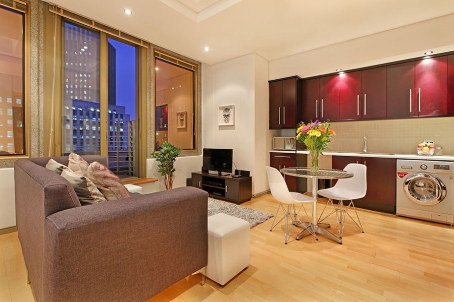 Yet at six floors up it’s quiet and sunny. The open plan design creates space for a queen-size bed, lounge with TV and satellite channels, a built-in kitchen with washing machine, dishwasher and café-style 2-seater table.