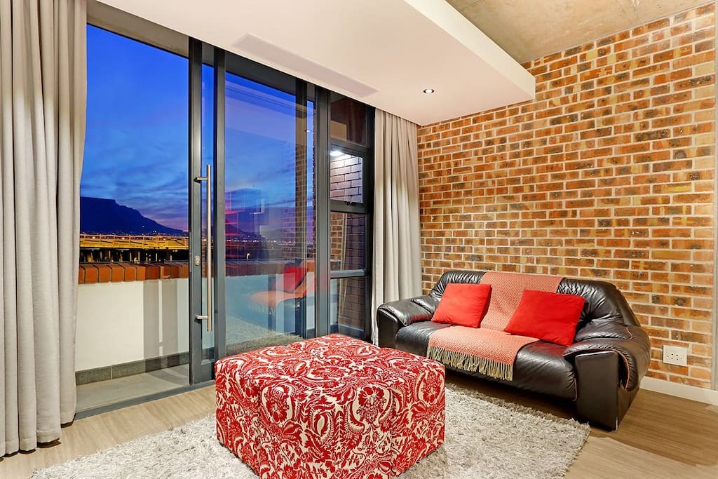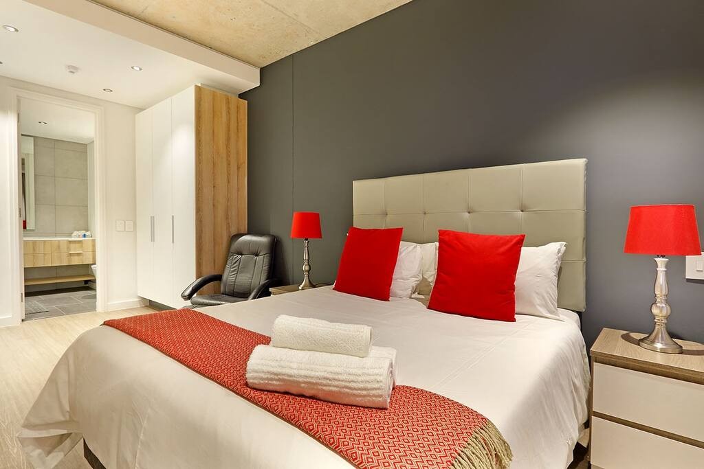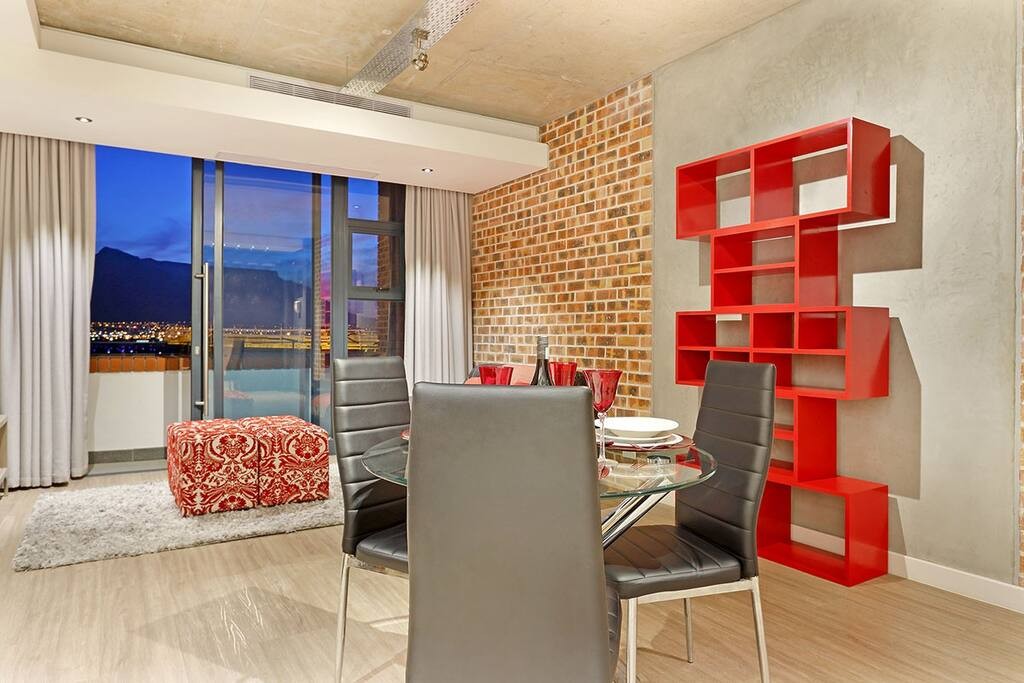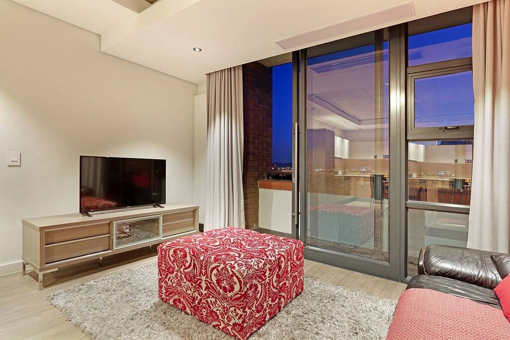 The main interior, with central air conditioning and stylish red tones, offers ample space with a kitchenette, dining area and lounge flowing into one another courtesy of an open-plan arrangement. The kitchenette features a microwave, fridge and freezer, kettle, toaster, oven and hob, as well as 2-in-1 washing machine and tumble dryer. The chic dining area has a glass table with 3 chairs. The lounge, with lavish seating, includes a flat-screen TV, with a DStv bouquet, and leads out to a balcony overlooking the area below and the stunning Table Mountain, the Cape Town Stadium and the Cape Town CBD.