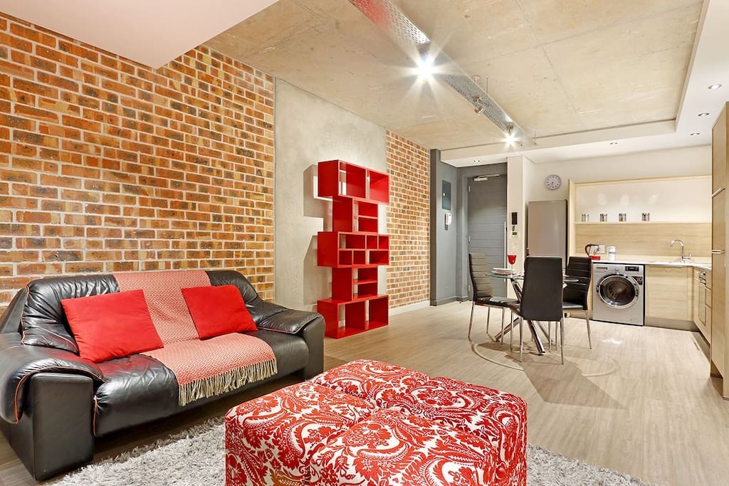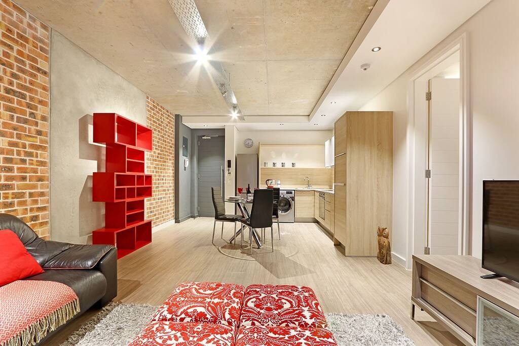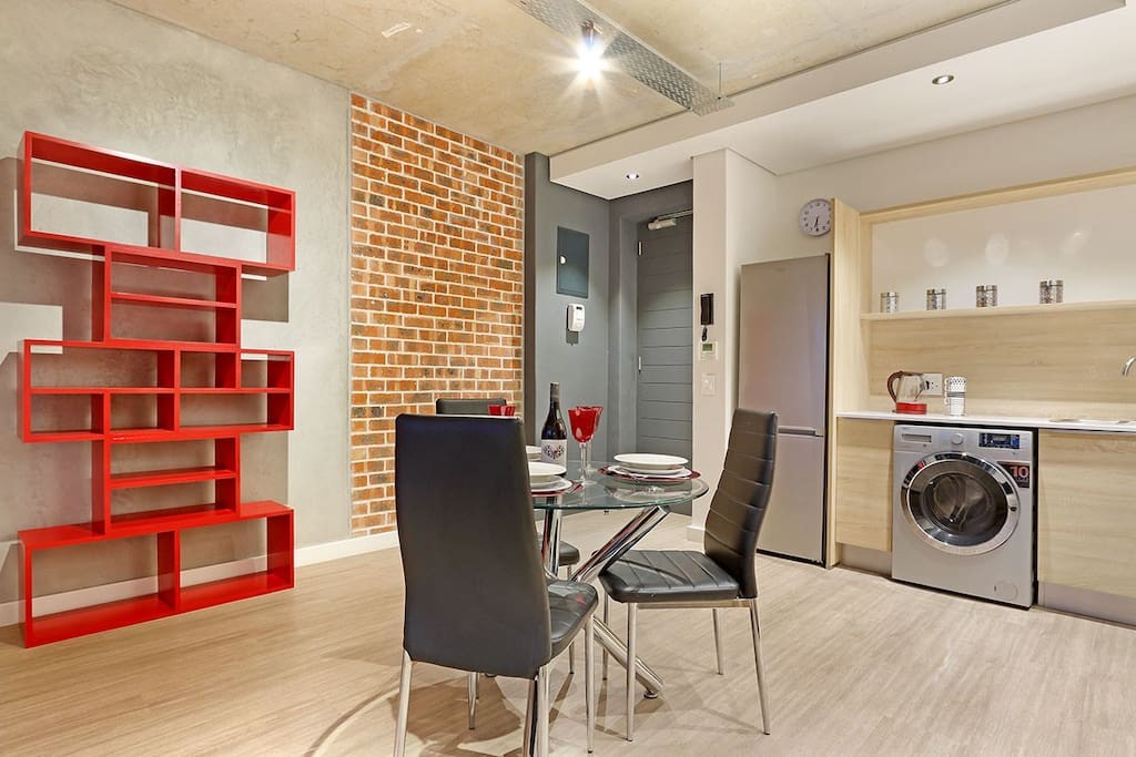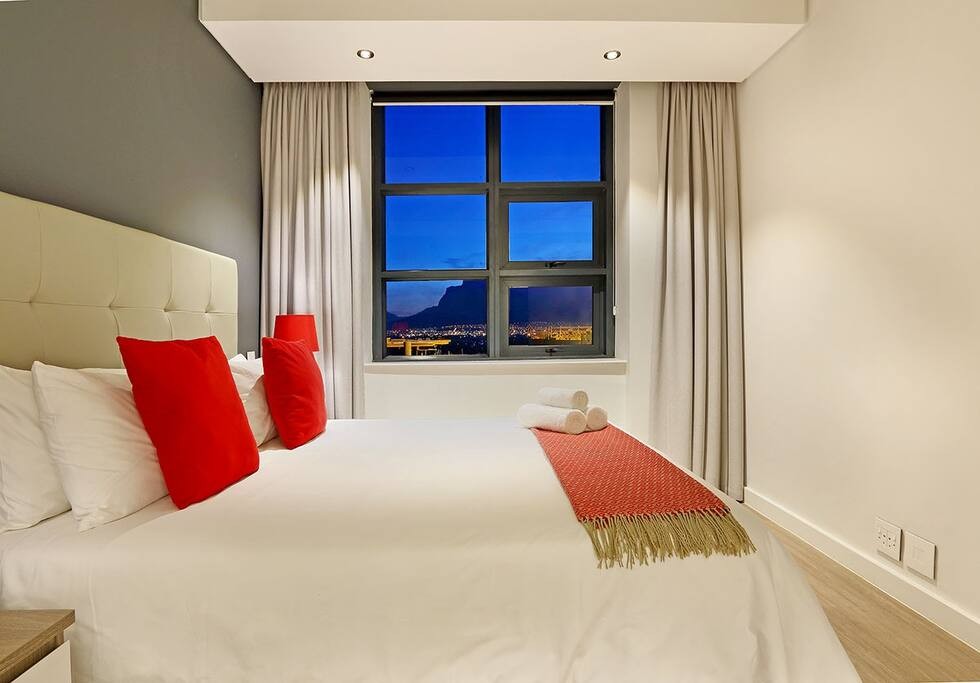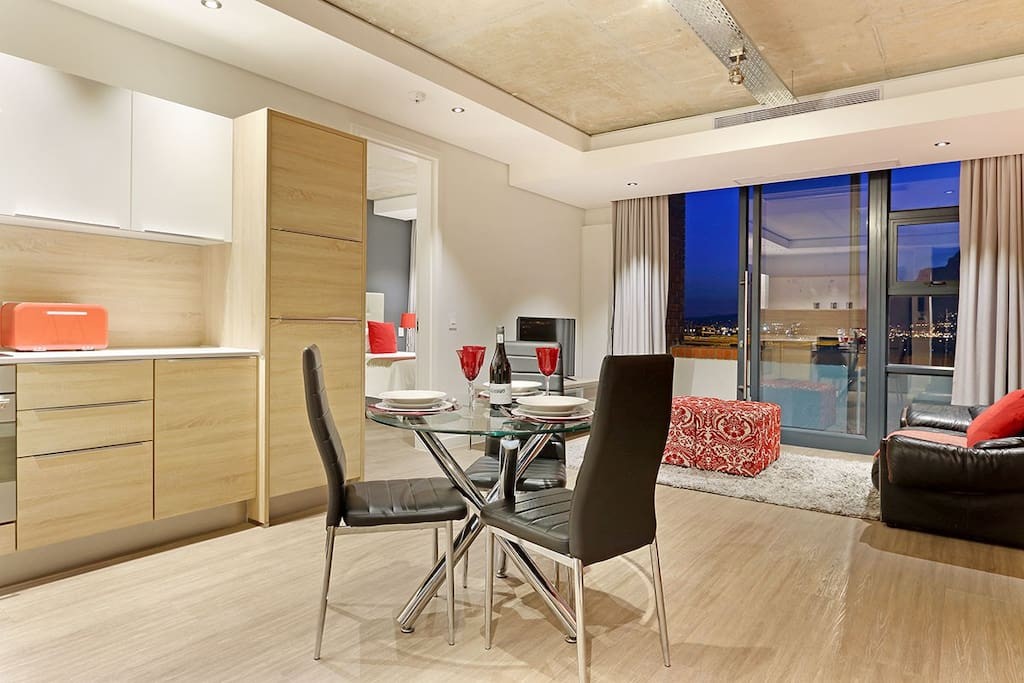 The main interior, with central air conditioning and stylish red tones, offers ample space with a kitchenette, dining area and lounge flowing into one another courtesy of an open-plan arrangement. The kitchenette features a microwave, fridge and freezer, kettle, toaster, oven and hob, as well as 2-in-1 washing machine and tumble dryer. The chic dining area has a glass table with 3 chairs. The lounge, with lavish seating, includes a flat-screen TV, with a DStv bouquet, and leads out to a balcony overlooking the area below and the stunning Table Mountain, the Cape Town Stadium and the Cape Town CBD.