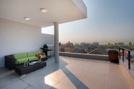 The terrace wraps right around the front and side of the apartment, and all of the bedrooms have doors that open onto it.