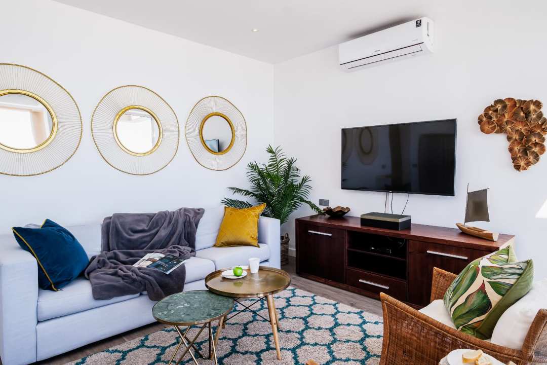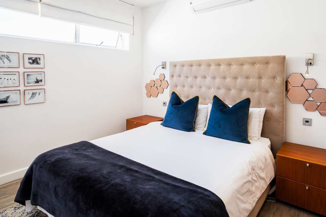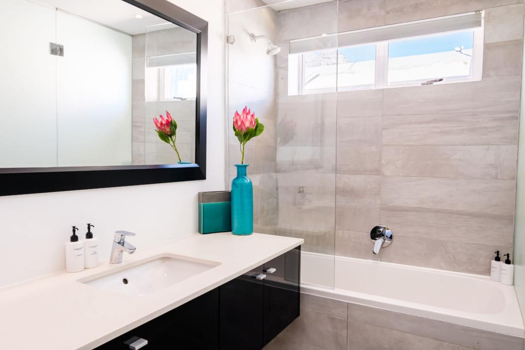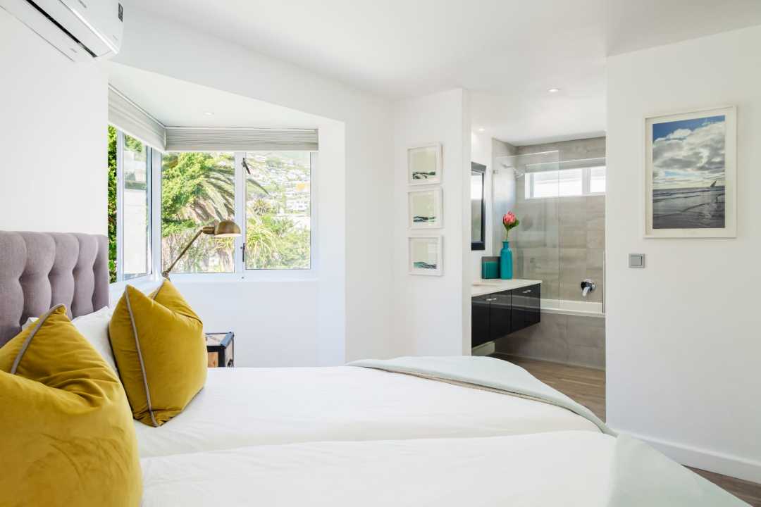 Crisp, white linen and simple, clean lines reflect the beach-house feel in the apartment’s two bedrooms. The ocean bedroom has a king-sized bed, ample cupboard space and an en-suite bathroom with a shower and toilet. The mountain bedroom has twin beds, which can be converted into a king sized bed, and an en-suite bathroom with a bath (and shower over the bath).