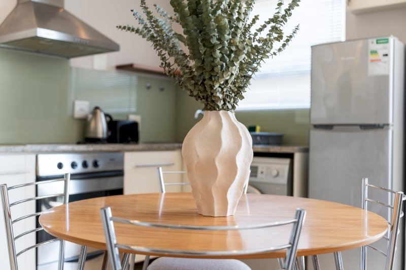 The open-plan lounge and dining area is bright, airy, and thoughtfully designed for both leisure and productivity. Comfortable seating, a flat-screen TV with Netflix and Amazon Prime, and high-speed WiFi make it ideal for unwinding or remote work. Glass doors open onto a small balcony, extending the living space outdoors.