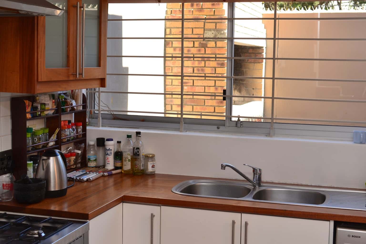 The apartment sleeps 4 people comfortably. There is a bed in the TV room which can accommodate a 5th person if required. The kitchen is open plan to the downstairs living area and is fully stocked. There is a washing machine, fridge and gas stove. There is also an outdoor braai area with table and chairs.