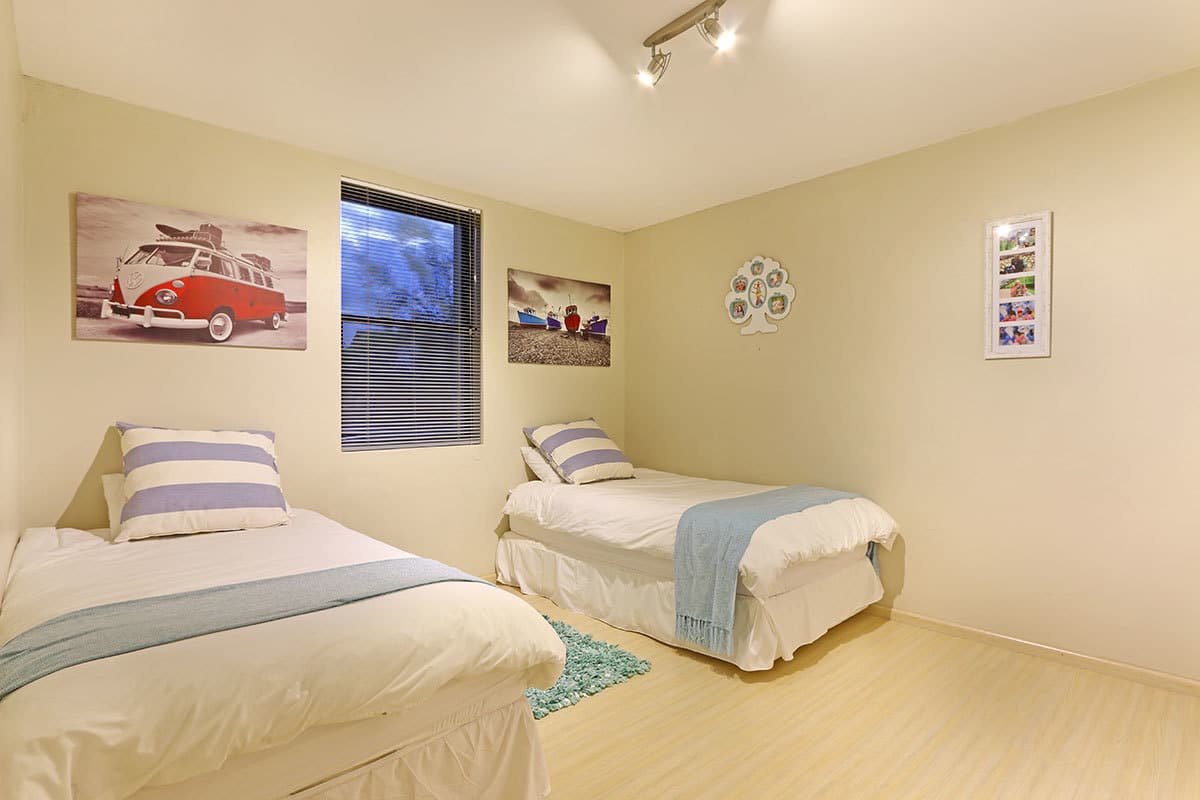 Towards the left is a large en-suite bedroom – (queen extra length bed) that leads out onto the lawn and lake with lovely views of the mountain. Behind this room are two bedrooms that share a bathroom; the one has two 3/4 beds and the second a queen bed.