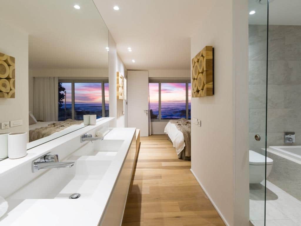 This opens onto the patio with a crystal blue swimming pool and relaxing loungers. All of the beds are made up with crisp white linen and neutral accents to promote a good night’s rest. The master bedroom has a king-size bed, dressing room, air-conditioning and en-suite with large bath. The second bedroom has a queen-size bed and third bedroom has twin beds, all are en-suite. Experience sunsets like you have never seen before.