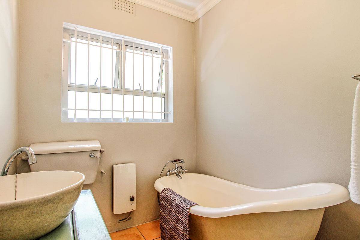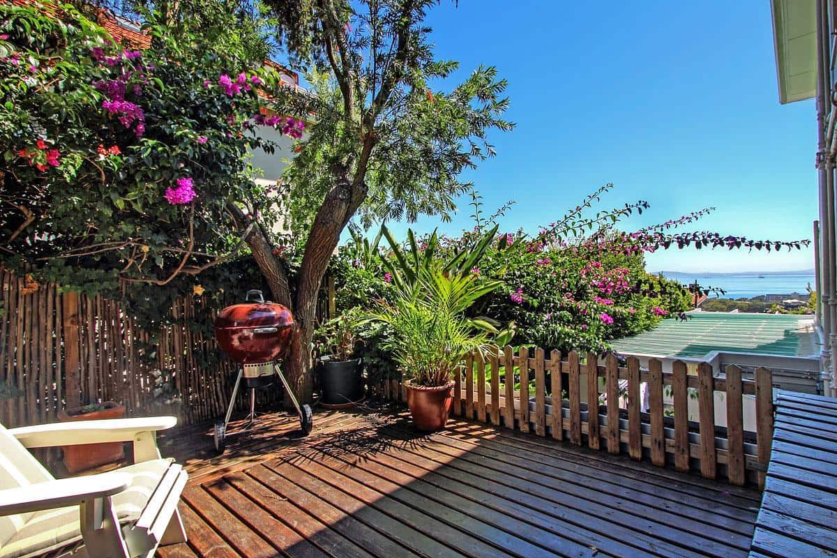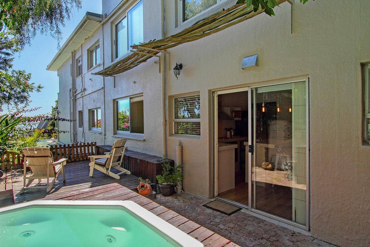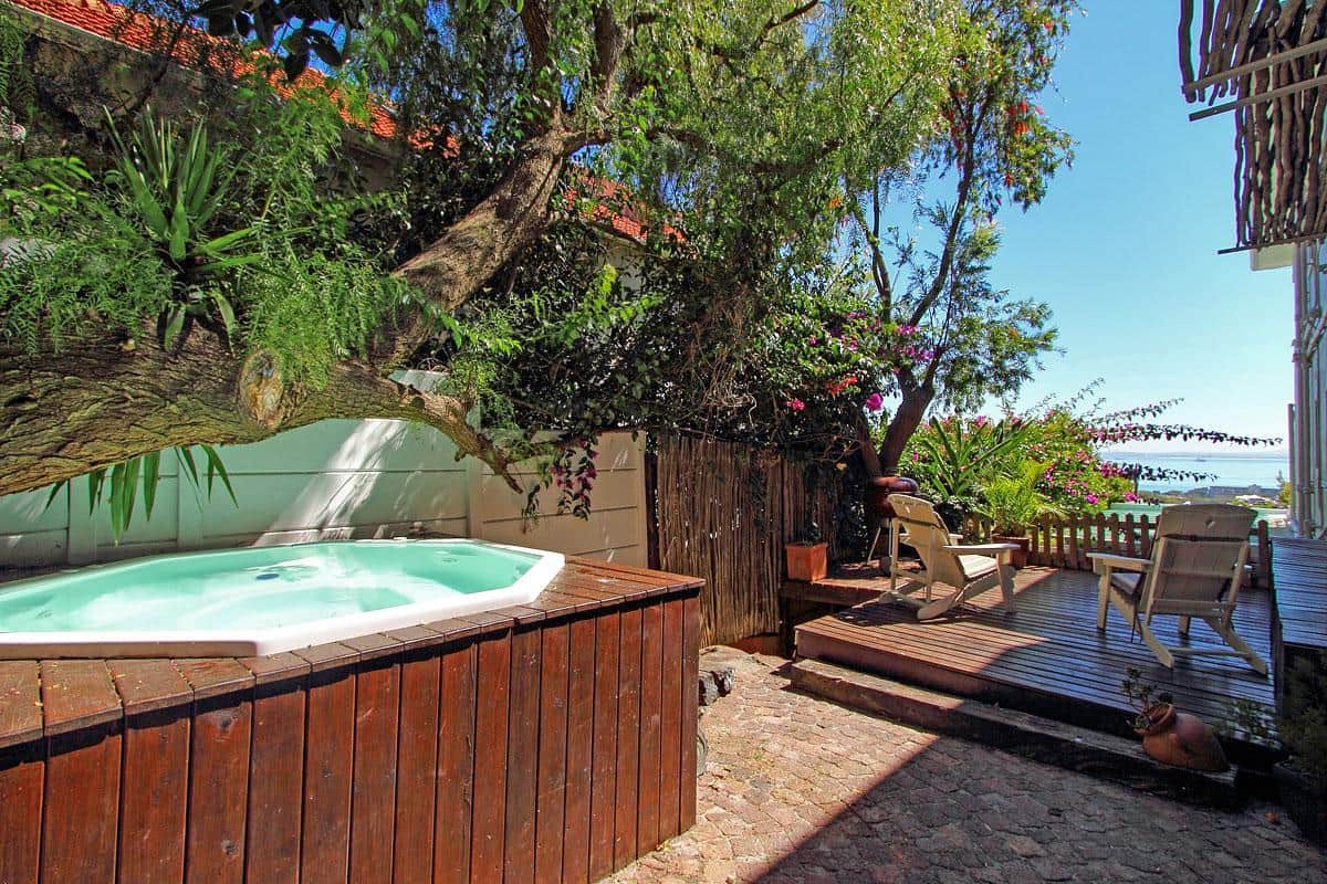 The timber deck is furnished with some lounge furniture. A large tree provides shade and also some nice sea views over the foliage. There is also a full size jacuzzi on the deck. Servicing is once/week if the stay is 7 days or longer. Otherwise it can be provided at an additional charge. Parking is on the road where there is plenty of relatively safe parking usually available. For security there is a security gate, burglar bars and alarm.