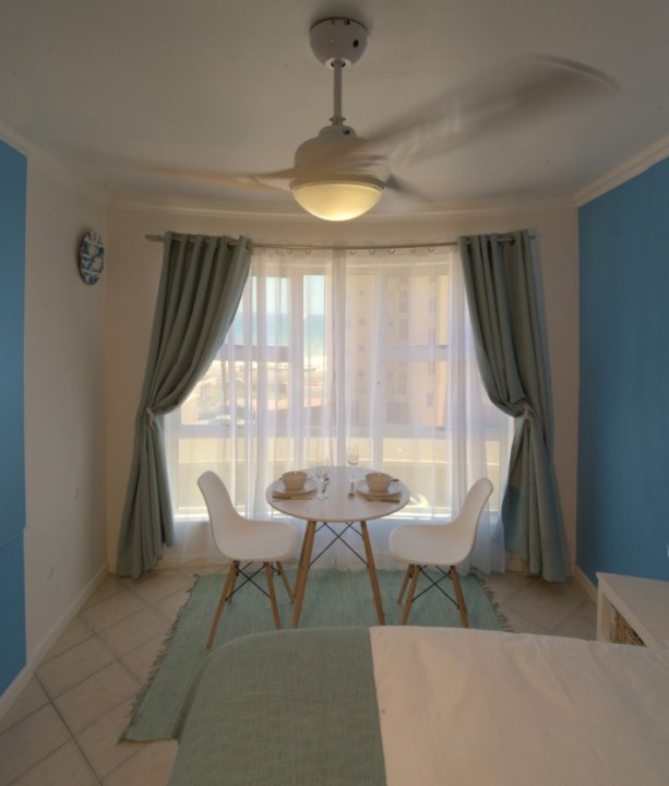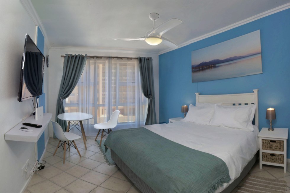 Ocean View is a stunning upmarket Bachelor apartment with fantastic Sea Views. This is a very comfortable pad with a Queen sized bed, Big screen TV with full DSTV, wall heater and ceiling fan to provide the perfect stay. It has a lovely spacious fully equipped kitchen with everything that you would need for your self-catering needs. The neat bathroom has a modern feel and shower for your convenience, and the apartment also has a laundromat on the ground floor. This delightful open-plan apartment is perfect for a romantic holiday breakaway, or business trip, with only one minute’s walk to the beach, and in close proximity to the local shops and some exceptional restaurants, as well as the MY Citi Bus route. This apartment is a true gem for any couple or business traveller and much sought after accommodation in the popular Bloubergstrand.