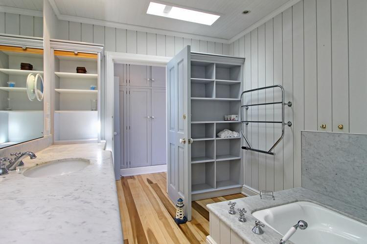 A sunken lounge and open plan dining area with beautiful wooden floors and beach house chic décor set the tone on arrival at the cottage. Stunning sea views are immediately present through sliding doors that open on a shaded wooden deck that overlooks the rocks and sea. Leading off the living area is a spacious sun room with unique ‘boulder couches’, hewn from the surrounding rock, and stylish bistro tables, making for an ideal spot to relax in the sun. A neat guest toilet is situated below the staircase.
