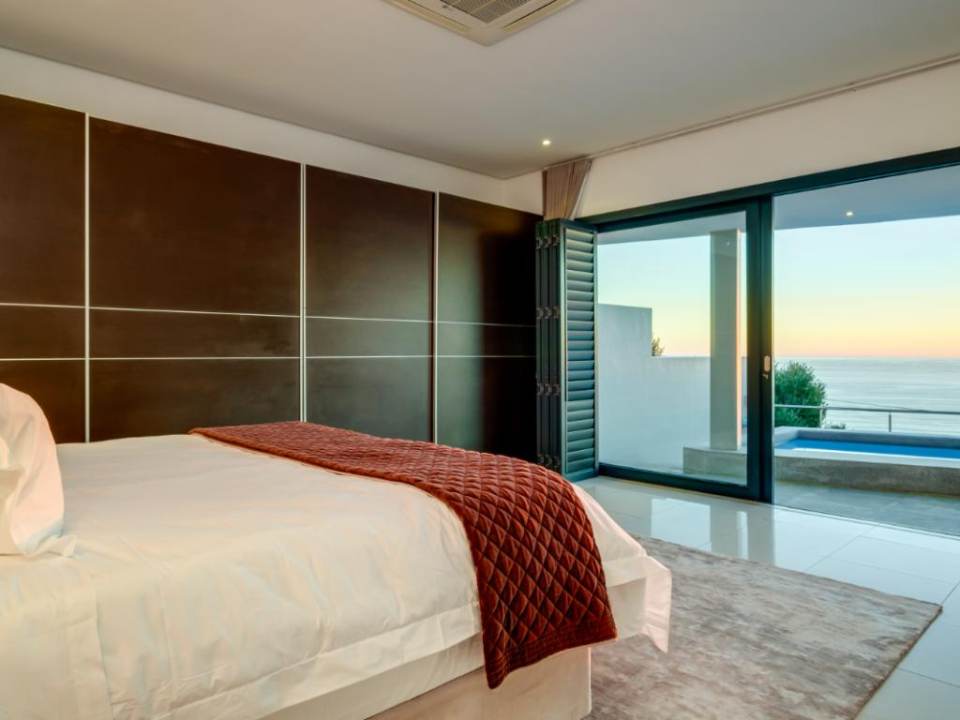 Overlooking the Atlantic Ocean in the glamorous seaside suburb of Camps Bay, this gorgeous villa is the perfect retreat for discerning guests looking for luxurious levels of privacy and comfort. The villa is split over two levels, with one bedroom on the lowest level and four bedrooms on the main level. The property is entered on the lowest level, which features a gym and one bedroom. The bedroom has a king bed and an en-suite bathroom with shower and bath, as well as air-conditioning. The second level houses the living spaces, kitchen and remaining four bedrooms. A contemporary-chic lounge with wood burning fireplace has comfortable couches and a large flat-screen television connects effortlessly with the dining area, which features a ten-seater dining table. A state-of-the-art kitchen is fully equipped with modern amenities. A separate scullery has a washing machine, tumble dryer and dishwasher. Bedroom one commands breathtaking ocean views with a luxury king-size bed, spacious en-suite bathroom with shower, bath and twin vanities and a private balcony is a perfect place to unwind and soak up the views. The remaining three guest bedrooms have king-sized beds, bathrooms, air-conditioning, and ample storage space. Each room has beautiful views of Lion’s Head, Table Mountain, or the vast Atlantic Ocean. Both the living and dining spaces open out onto a shady sea-facing wide terrace with a barbeque area and outdoor dining, sun loungers, and a salt-water lap pool. The house is fully secure with an alarm and has a double garage and ample on-street parking for guests.