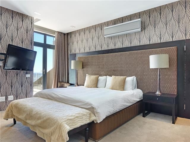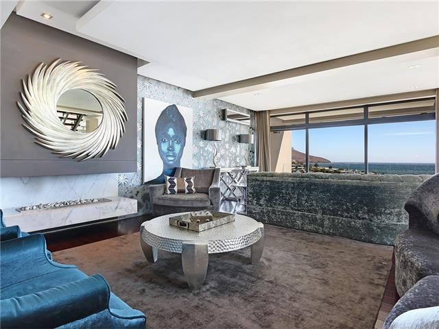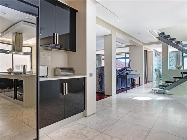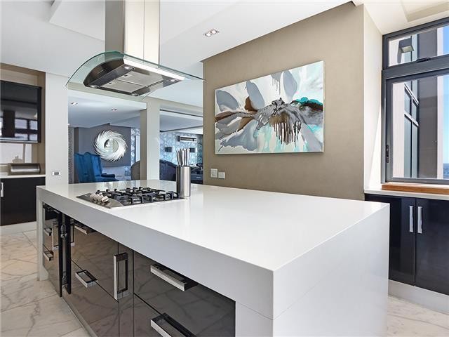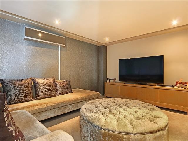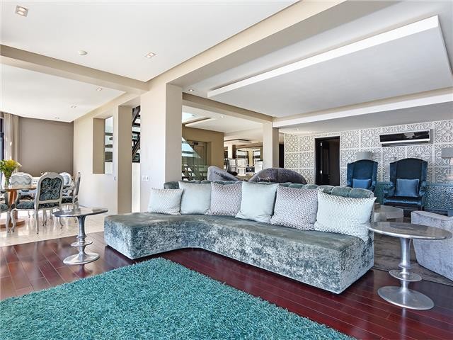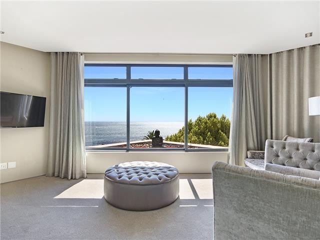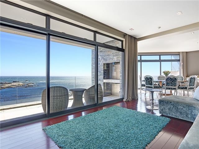 The open plan kitchen one level down is fully equipped with top of the range appliances and has a separate scullery. The kitchen opens onto the large living room and dining room. Ideal for entertaining this level has its own balcony with spectacular sea views, ample seating and a fireplace. There is also a separate cinema room for those who wish to have a breakaway.