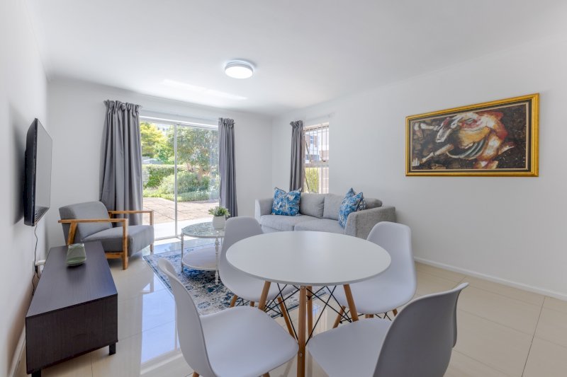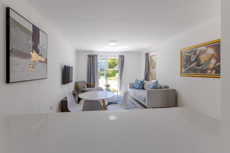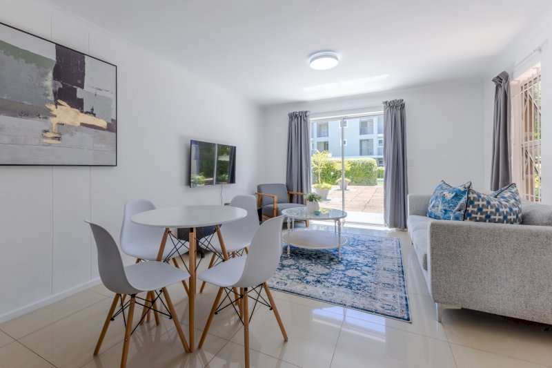The bright and airy open-plan living space is perfect for relaxing with loved ones or enjoying a quiet moment to yourself. The comfortable lounge area and fully equipped kitchen flow seamlessly onto the patio, creating the perfect space for soaking up the morning sun. Just a couple of feet from the patio, you’ll find the communal pool—a serene oasis ideal for a refreshing dip or relaxing after a day of exploration.