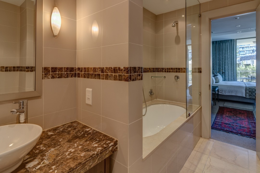 Everything is taken care of at the holiday apartment, from the impeccable maintenance of the property to the gardens and the swimming pools, and the security is impenetrable. A system of boardwalks and bridges over the waterways leads to communal pools, to the heart of the Waterfront or to the centre of Cape Town. It’s a wonderful place for a gentle evening stroll, as a myriad of little blue lights turn the marina into a fairyland.