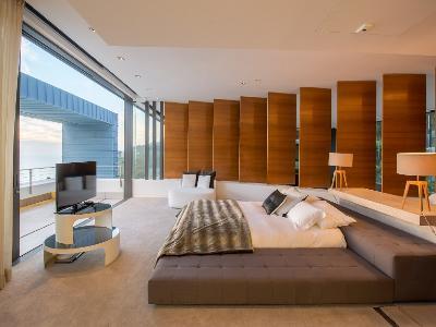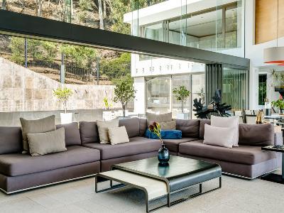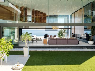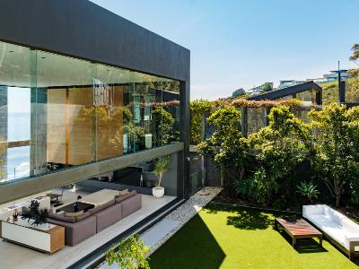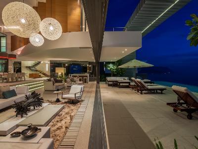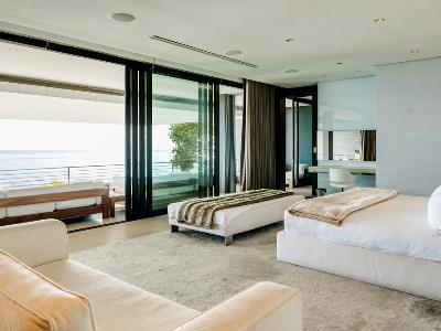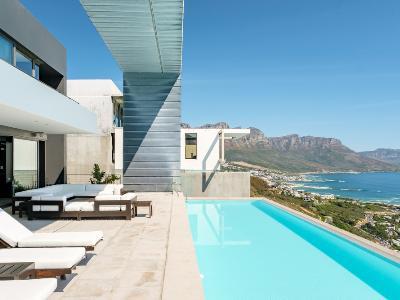One of the most sort after rental properties on the Atlantic Seaboard, Pentagon is a Stefan Antoni development with the incredible interiors done by ARRCC. This extraordinary villa is fully automated and has a state of the art automatic generator.. Uninterrupted breathtaking views of the ocean, 5 en-suite bedrooms, gym and cinema room and an incredible open plan entertainment area, this 6 star villa also comes with staff to see to your every need. The villa is set over 2 levels, with the upper level comprising of the main entertainment space including lounge, dining area, bar and kitchen. This open plan space has huge doors opening outwards towards the ocean as well as to the rear, onto the mountain. It is a magnificent entertainment haven, with incredible views and vast space, ensuring privacy from every angle. On a mezzanine level just above is the 2nd master en-suite bedroom with large dressing area. The lower level comprises of the remaining 4 en-suite bedrooms, including the master suite, with projector TV and private office. All have access to the balcony with outside lounge furniture. There is a gym on this level as well. There is ample garage space on ground level with lift access to the main villa from below.
