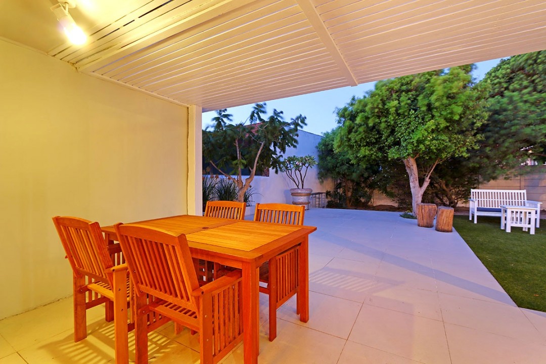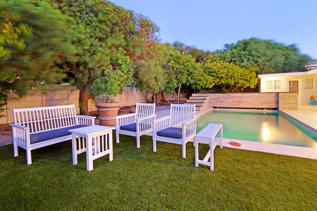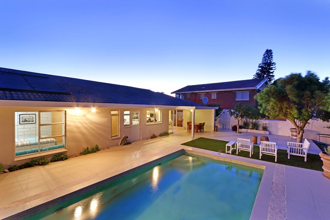 The small outdoor dining area seats 4 in a quaint garden. The larger outdoor area features dining for 4, large garden with outdoor lounge furniture and a generously sized pool. The holiday home sleeps 9 with 3 bedrooms with double beds in the main house and a single bed and 2 bunk beds in the flatlet. 2 bathrooms are available.