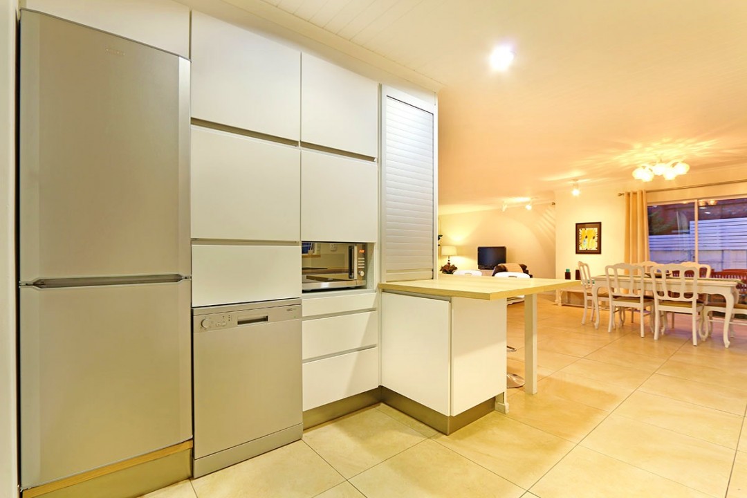The spacious and inviting main interior is open plan with the kitchen, dining area and lounge. The fully equipped kitchen, with modest styling has all the necessary utensils and appliances for a private holiday at your own pace. The nearby and charming dining area, with seating for 6, leads out to a vast outdoor entertainment area as well as a smaller, cosy out dining area. The lounge, with a luxurious 2-seater couch, L-shaped couch and the lovely sea and mountain views, features a flat-screen TV with a DStv bouquet and DVD player.