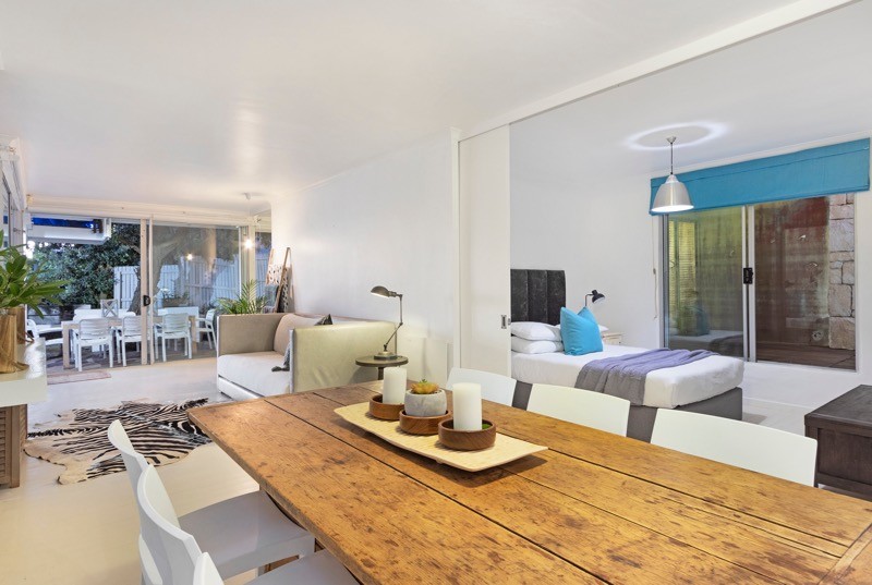 Large doors open onto an expansive patio where outdoor living truly comes to life. Here, guests can lounge beside the sparkling saltwater swimming pool, enjoy meals at the outdoor dining table, or relax under the shade while overlooking the lush green garden.